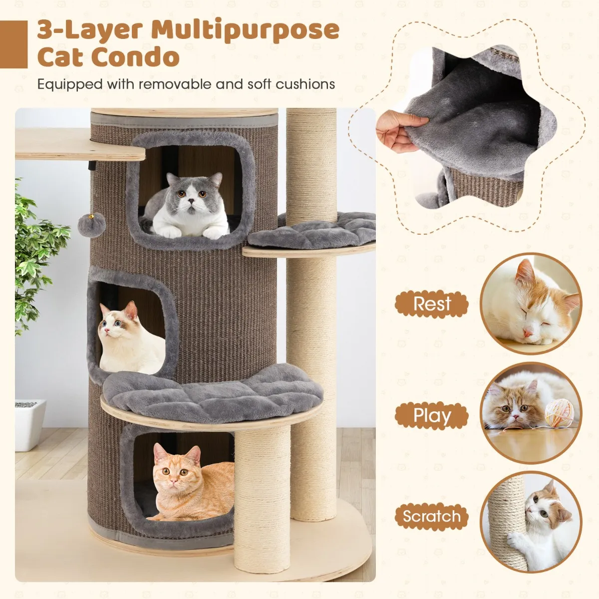 【Comfortabele kattenflat met 3 verdiepingen】 Een van de hoogtepunten van de krabpaal zijn de 3 condo’s, ontworpen met 3 ingangen, voor gemakkelijke toegang met behoud van een veilige en privé ruimte. De binnenkant van de condo is voorzien van een zacht kussen, waardoor je katten een comfortabele plek hebben om te ontspannen en op te laden.