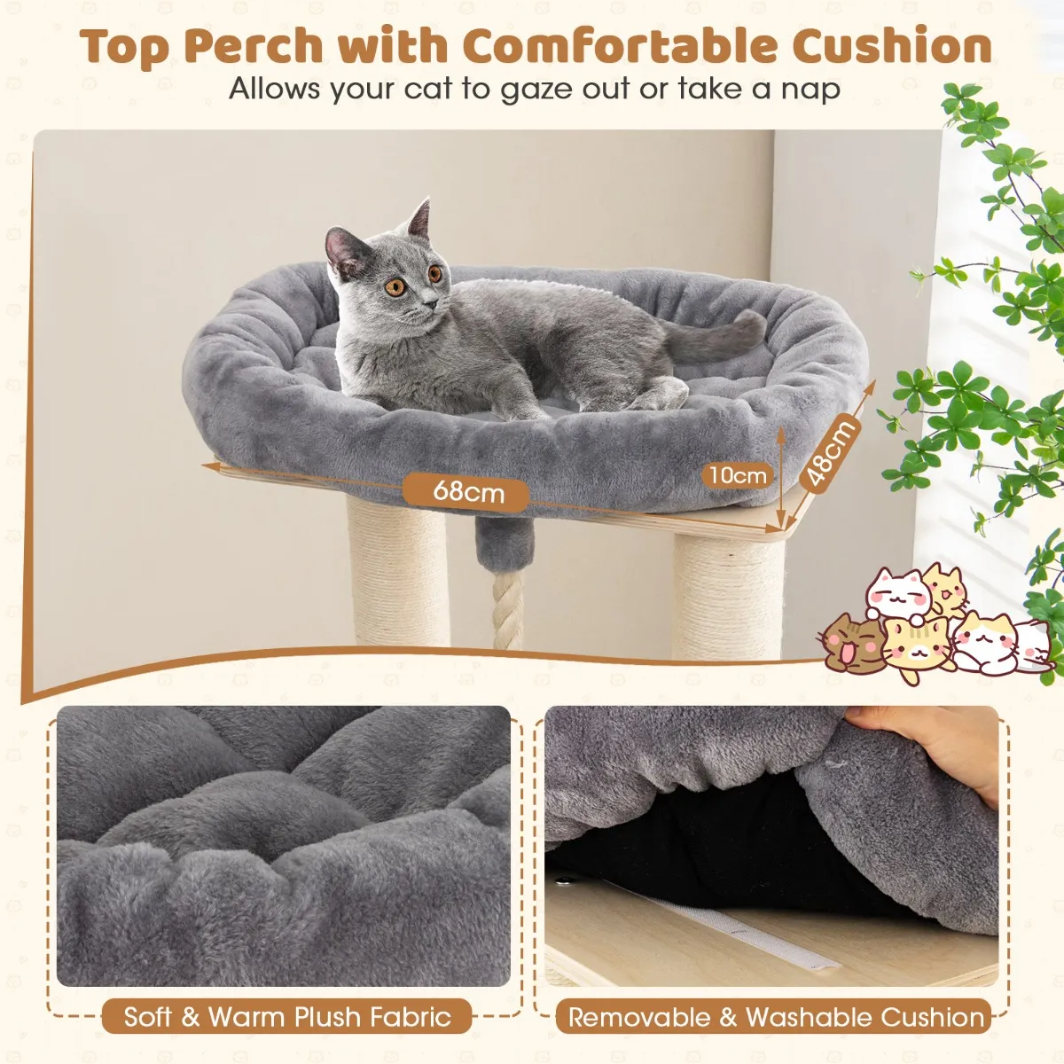 【Comfortabel, veilig ontwerp】 De multi-level krabpaal wordt geleverd met zachte kussens zodat je viervoeters kunnen genieten van verschillende activiteiten zonder hun gewrichten te bezeren. Bovendien zijn deze kussens afneembaar en wasbaar voor langdurig gebruik. En de randen zijn gepolijst om te voorkomen dat je katten zich pijn doen.