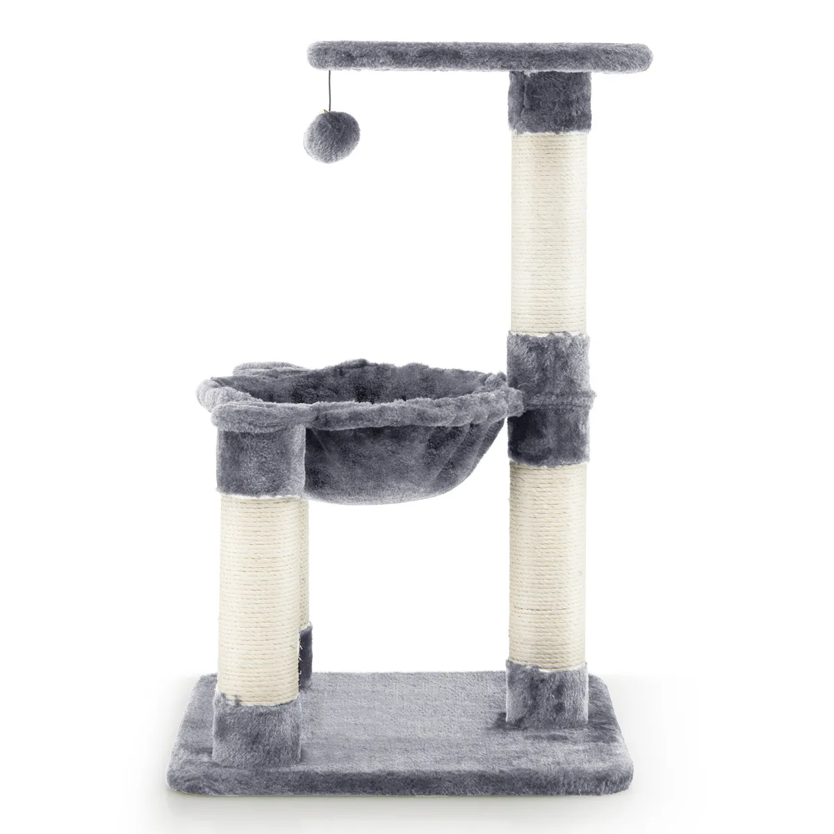 Multifunctionele kattenklimboom! Onze kattenklimboom met drie niveaus is goed ontworpen en heeft een groot bovenste platform waar katten op een zonnige dag op kunnen liggen. Bovendien heeft de kattenklimboom een comfortabele hangmat, perfect voor katten om een lunchpauze te nemen. En elk platform is omwikkeld met zachte, huidvriendelijke pluche kussentjes om de pootjes van uw kat beter te verzorgen. Onze kattenklimboom wordt ook geleverd met een pluche bal en drie volledig omwikkelde sisalpalen om de actieve en kriebelende aard van uw kat volledig tevreden te stellen en uw meubels te beschermen tegen schade. De kattenklimboom met meerdere niveaus heeft een draagvermogen van 10 kg per niveau, zodat kleine tot middelgrote katten zich erop kunnen bewegen zonder dat hij kantelt of instort. Bovendien is deze kattenklimboom eenvoudig te monteren en vereist geen extra gereedschap. Daarom is onze compacte kattenklimtoren geschikt voor thuis, dierenwinkels en kattencafés.