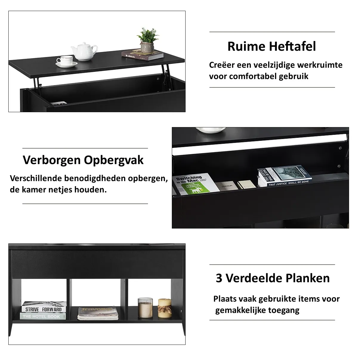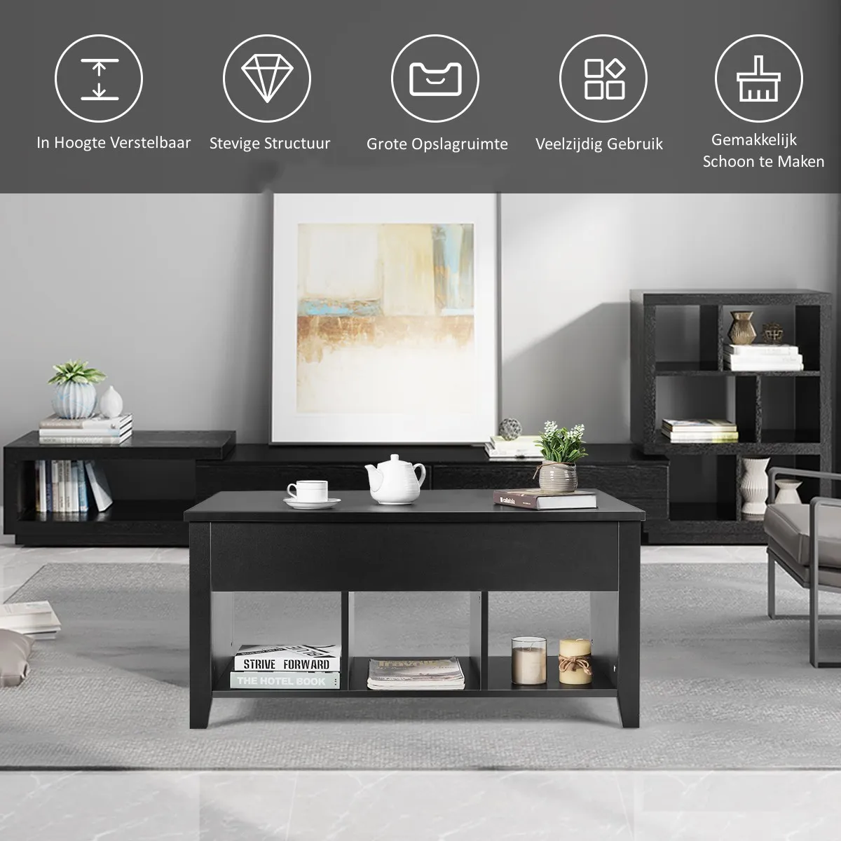 Dan heeft u een kwalitatief hoogwaardige salontafel nodig met voldoende opbergruimte in uw woonkamer. Dit is een nieuwe salontafel, met een blad dat op en neer kan worden getild tot verschillende hoogtes voor meerdere functies. Onder het blad is er een verborgen opbergruimte voor uw dagelijkse voorwerpen, zoals boeken, tijdschriften, gamecontrollers en afstandsbedieningen. Bovendien zijn er drie open planken aan de onderkant, die aan uw verzamelbehoeften voldoen en het ruimtegebruik verbeteren. Deze salontafel met een speciaal ontwerp zal niet uw verkeerde keuze zijn. Aarzel niet meer. Kom tot aankoop!