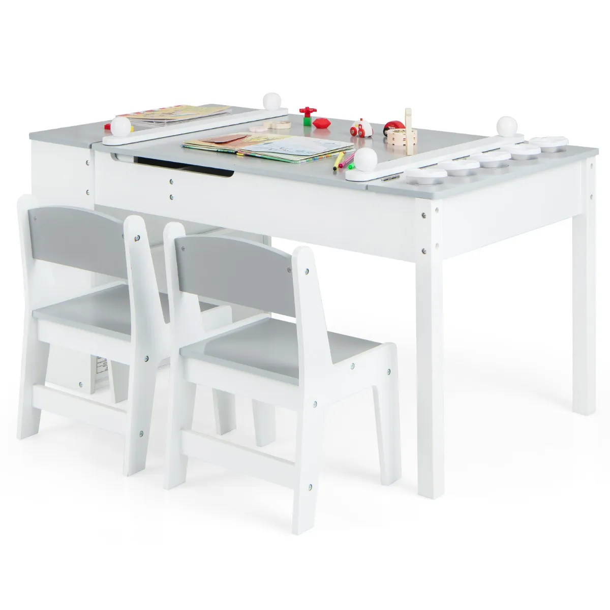 Deze tafel- en stoelset voor kinderen heeft een opklapbaar tafelblad, waardoor de tafel in een ezel kan worden veranderd. Het blad wordt opgetild door een duurzame hydraulische stang, waardoor het langzaam kan zakken voor meer veiligheid. De uitgesneden handgreep beschermt tegen onbedoeld letsel. Er is veel opbergruimte voor verschillende benodigdheden, waaronder een dienblad, verborgen opbergvakken onder het dienblad, 6 verwijderbare bakken met handgrepen en 5 verfpotten. Deze multifunctionele set is ideaal voor speelkamers, kinderkamers, kleuterscholen en kinderdagverblijven.
