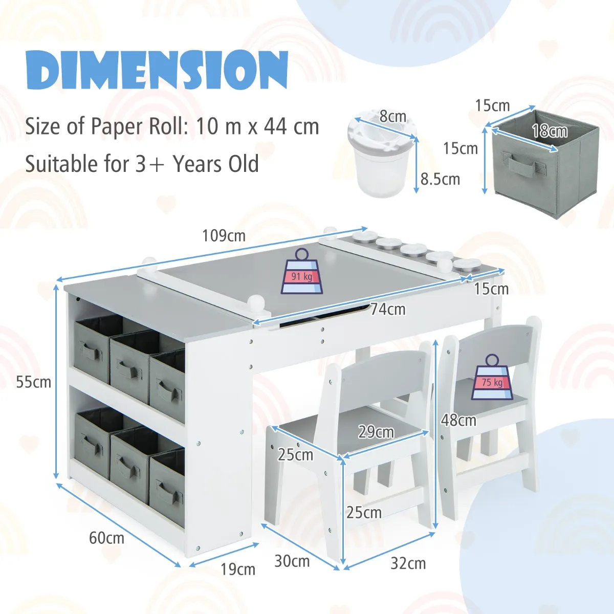 - Verpakking: 1 x Tekentafel voor kinderen2 x Stoelen1 x Papierrol5 x Gekleurde bekers6 x Opbergdozen1 x Handleiding