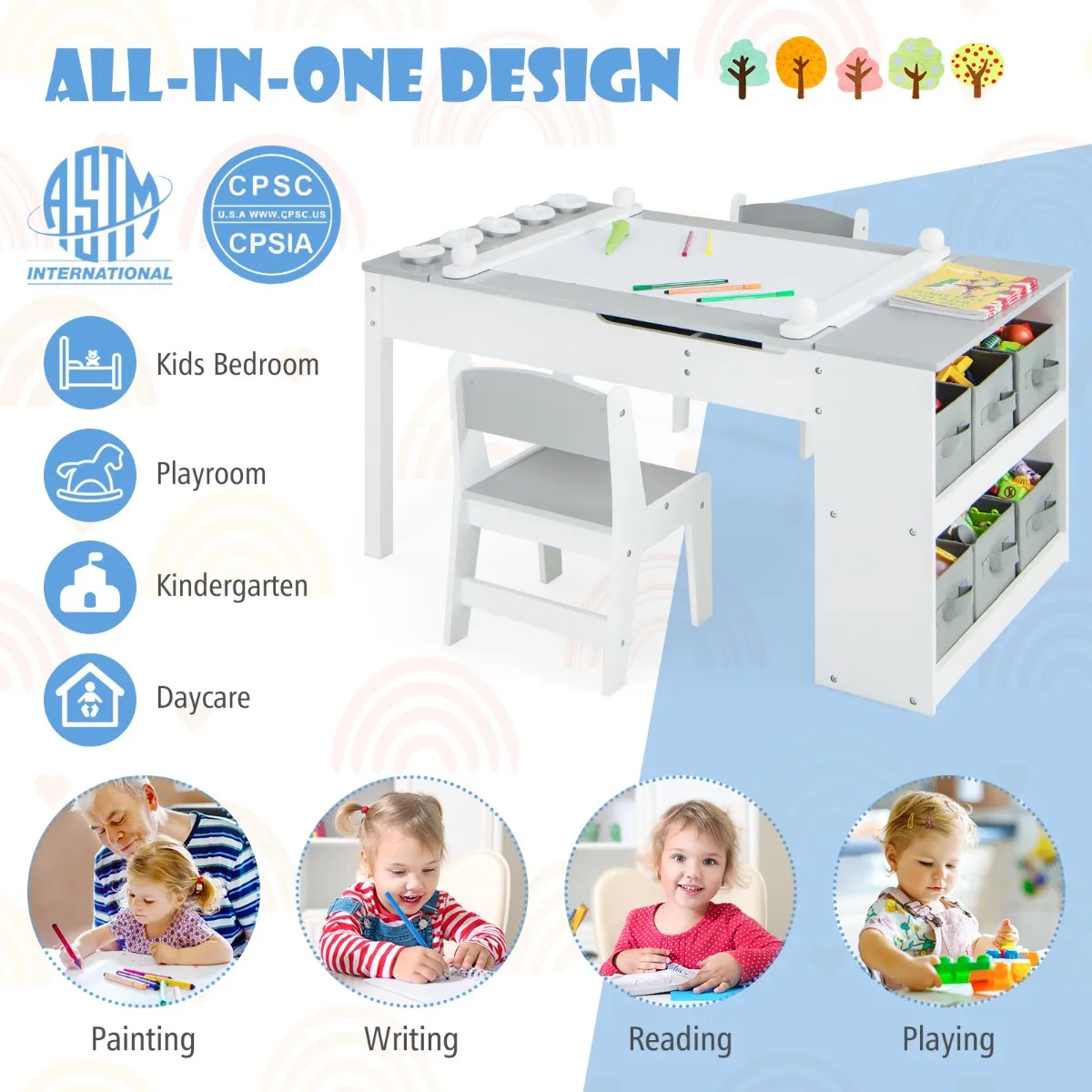 Veilig ontwerp:Â Deze activiteitentafelset voor kinderen is gecertificeerd om ouders gemoedsrust te geven. Het doordachte ontwerp van de langzaam dalende hydraulische stang en de uitgesneden handgreep voorkomt dat de vingers van je kleintje per ongeluk bekneld raken. Bovendien voorkomen de gladde, afgeronde hoeken onverwachte verwondingen.