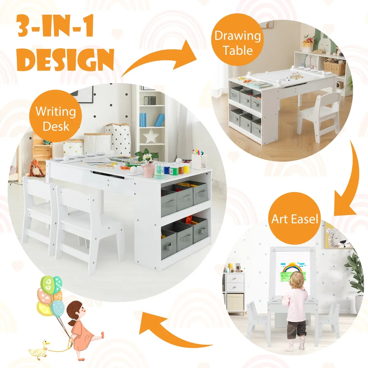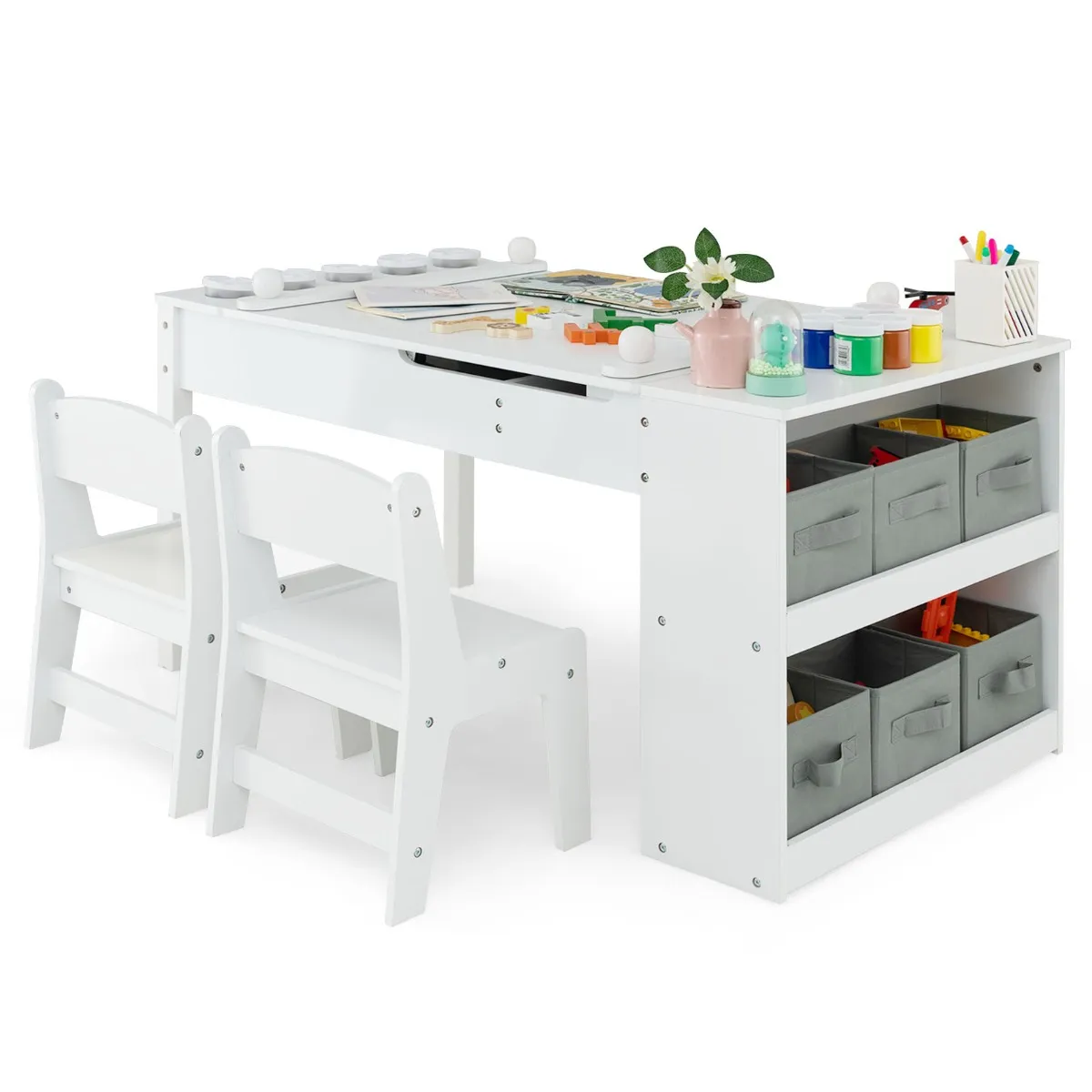 Grote opslagcapaciteit en veel accessoires:Â Verborgen opslagruimte onder het ruime bureau kan worden gebruikt om boeken, schildergereedschap, schrijfgerei en nog veel meer op te bergen. Op de open zijplanken met 2 niveaus staan 6 verwijderbare opbergdozen met handgrepen om andere benodigdheden in op te bergen. 5 verfpotten met handgrepen zijn inbegrepen voor extra gemak.