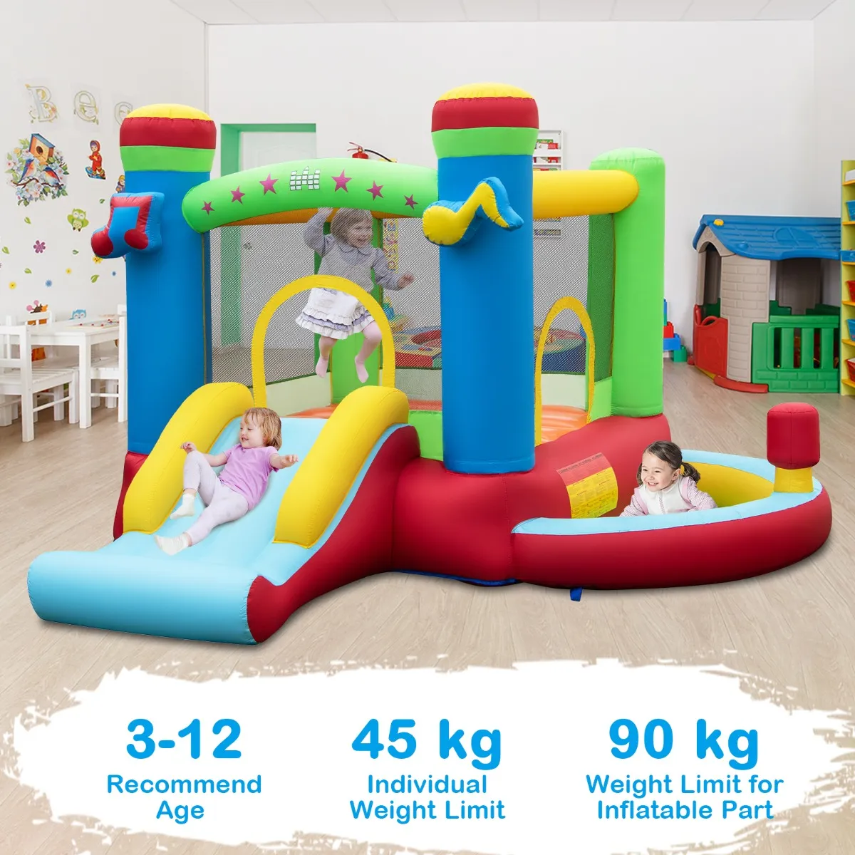 【Duik in een muzikale speeltuin】: Dit springkasteel met muziekthema is ontworpen om je kleintjes te vermaken, perfect voor feestjes, familiebijeenkomsten of alledaags spel in de tuin of op het gazon. Het springgedeelte biedt veel ruimte voor springplezier, terwijl de aangebouwde glijbaan een extra dosis sensatie toevoegt.