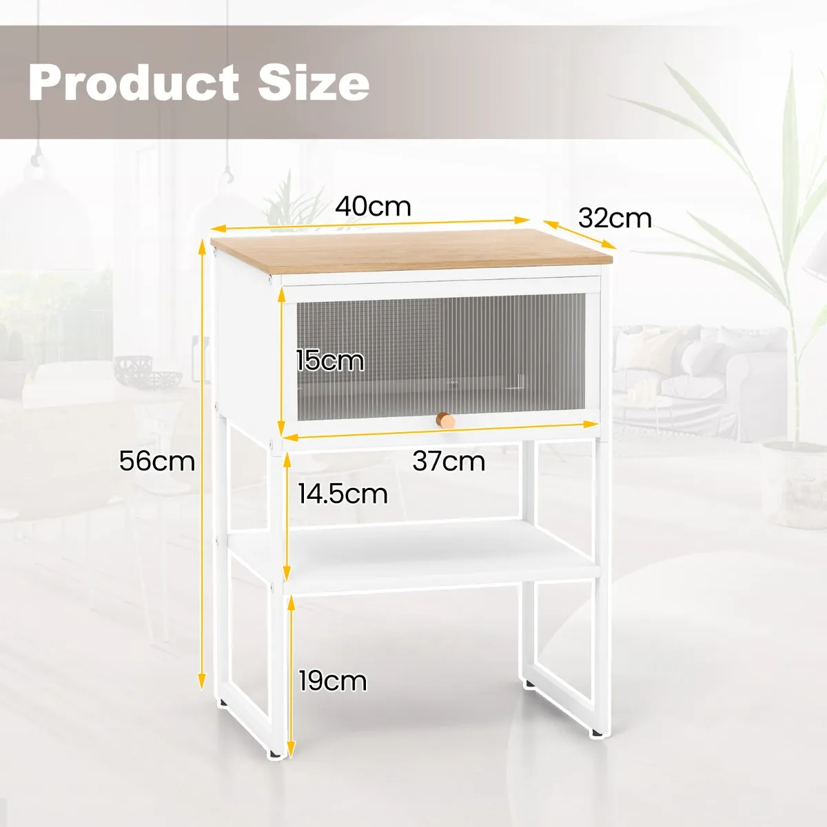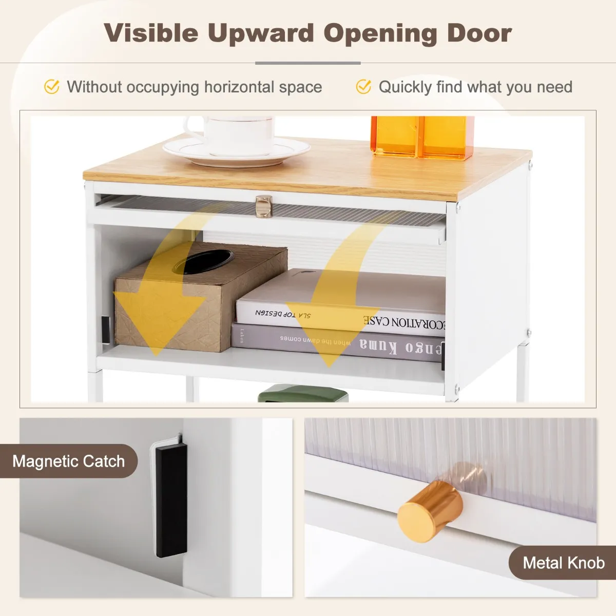 Verbeterde scharnierdeur: Het nachtkastje heeft een transparante, naar boven openende deur waardoor je snel vindt wat je nodig hebt en stof buiten houdt. Het neerklapbare ontwerp zorgt voor handig opbergen zonder horizontale ruimte in te nemen.