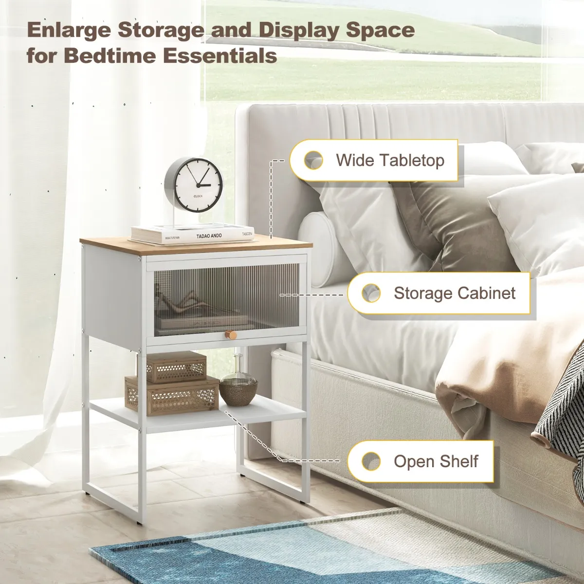 Meer opbergmogelijkheden: Het nachtkastje heeft een breed blad en een open plank om meer opberg- en displayruimte te bieden voor de benodigdheden voor het slapengaan. Je hoeft je dus geen zorgen te maken over rommel in de kamer.