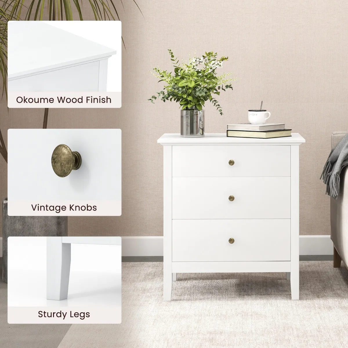 Verfraai uw decoratie met tijdloze elegantie:Â Het nachtkastje met 3 lades heeft strakke lijnen en een elegante afwerking die verfijning en charme toevoegen aan uw woonruimte. Samen met de verfijnde ronde knopen ziet het er super schattig en elegant uit en past het bij elke decoratiestijl!