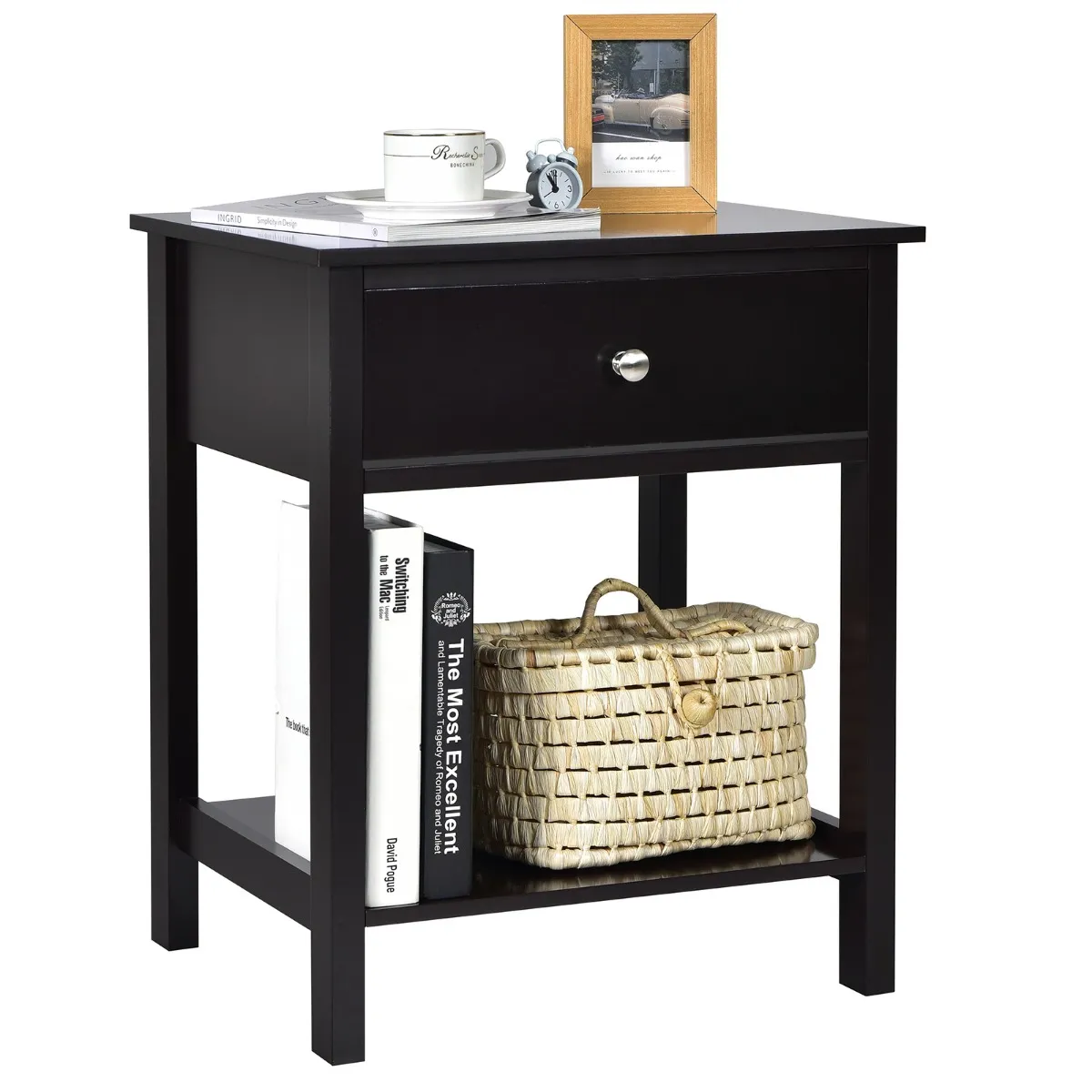 Deze multifunctionele bijzettafel kan worden geplaatst in de slaapkamer, woonkamer, inkomhal of sommige kleine plaatsen voor extra opbergruimte. Met een ruim tafelblad, praktische lade en open plank, kan ons nachtkastje verschillende dagelijkse benodigdheden opslaan en organiseren, waardoor uw kamer opgeruimd en netjes is. Gladde lade geleiders en de kleine handgreep zijn ontworpen voor handig gebruik. Gecombineerd met een moderne uitstraling en een beknopt ontwerp, is onze nachtkastje een geweldige aanvulling voor uw huis. Wat betreft de kwaliteit, gemaakt van eersteklas MDF en gefabriceerd hout, dit nachtkastje heeft een uitstekende stabiliteit en kan u dienen voor een lange tijd. Bovendien is het dankzij het compacte ontwerp gemakkelijk te verplaatsen en neemt het niet veel vloerruimte in beslag.
