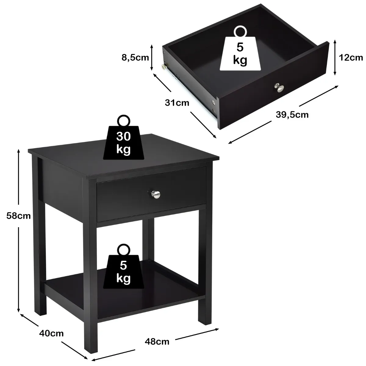 【Stevig frame en duurzaam materiaal】Het hele nachtkastje is gemaakt van hoogwaardig MDF samen met gefabriceerd hout, wat zorgt voor een sterke stabiliteit en duurzaamheid voor langdurig gebruik. Het tafelblad kan een gewicht tot 30 kg dragen, terwijl de lade en het schap een gewicht tot 5 kg kunnen dragen.
