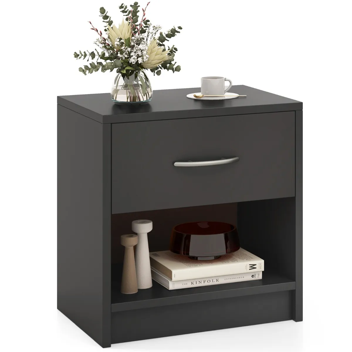 【Ingedeeld opbergvak】: Dit nachtkastje heeft een ruim bovenblad om benodigdheden bij de hand te houden en een uittrekbare lade om persoonlijke spullen in op te bergen. Onder de lade biedt een open plank extra ruimte voor verschillende spullen.