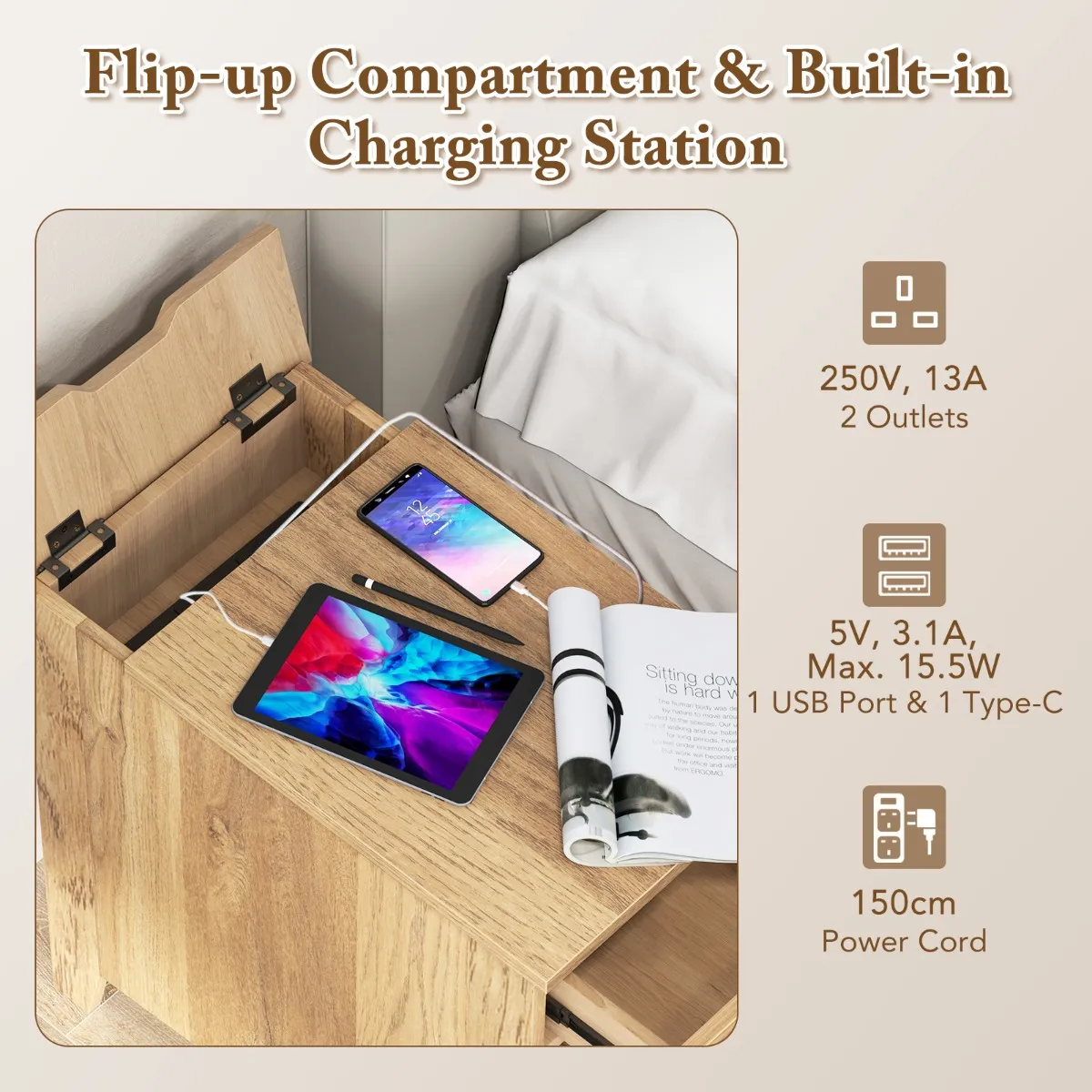 【Meerdere stopcontacten voor eenvoudig opladen】: De bijzettafel heeft een geïntegreerd oplaadstation (2 stopcontacten, 1 USB en 1 Type C) dat een flexibele stroombron biedt voor verschillende elektronische apparaten. De goed verspreide stopcontacten voorkomen dat adapters in elkaar vast komen te zitten.