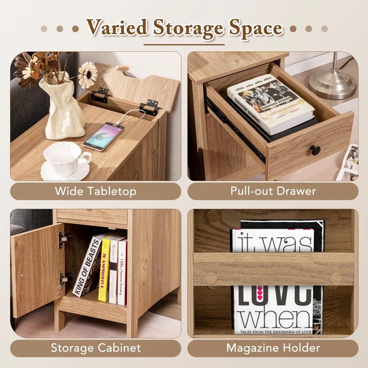【Inklapbaar vak】: Het inklapbare vak verbergt rommelige snoeren, zodat de ruimte netjes blijft en je elektronica toegankelijk is. Bovendien kunnen stroomkabels er gemakkelijk doorheen dankzij de groef.