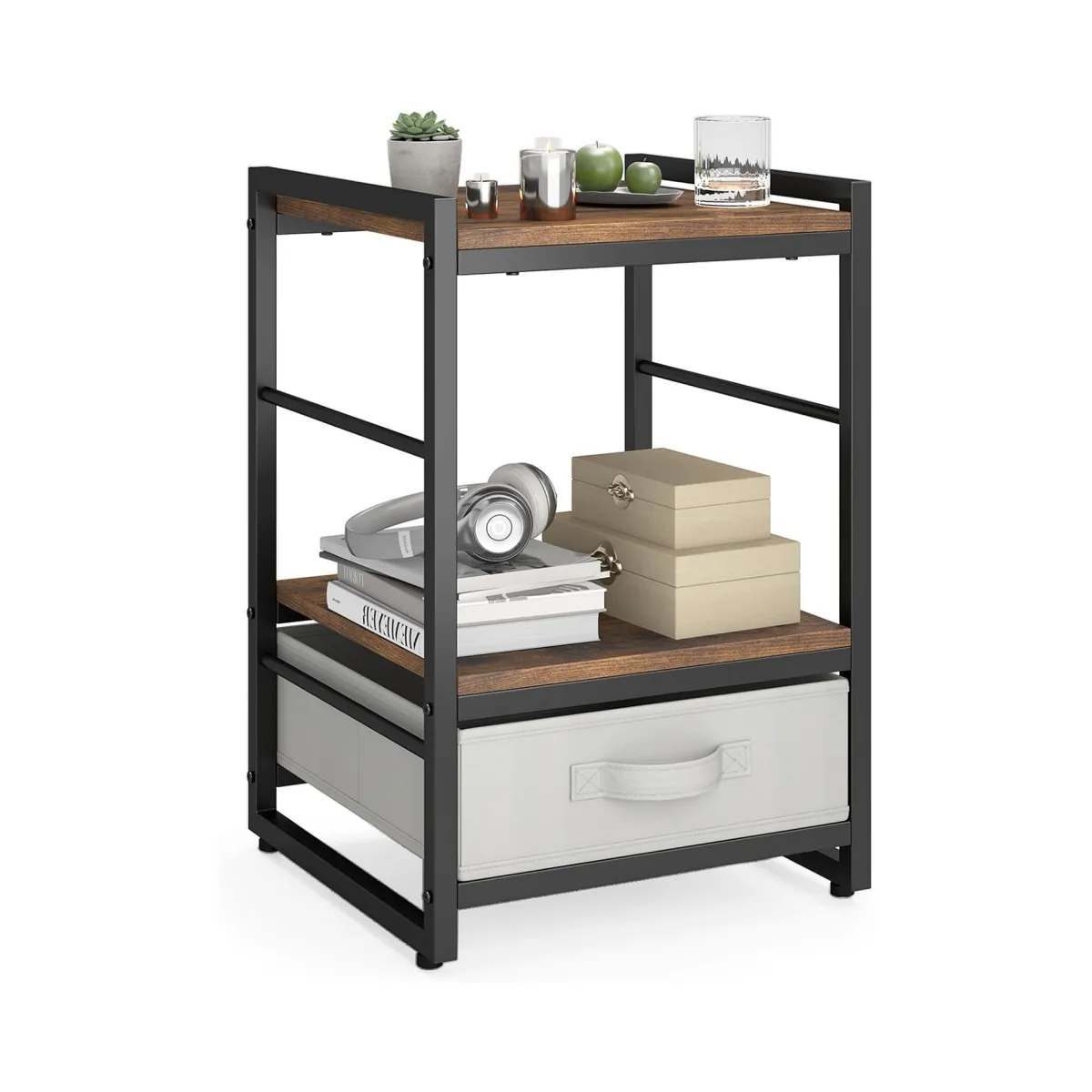 Ons nachtkastje beschikt niet alleen over een ruim tafelblad en een open plank, maar ook over een discrete, chique stoffen lade. Met zijn robuuste metalen frame in industriële stijl en de verstelbare voetkussens staat hij stabiel op elk oppervlak, wat zijn duurzaamheid en aantrekkelijkheid verhoogt. Werp een blik op zijn rustiek-moderne design met een warme houtnerf op een elegante matzwarte afwerking, perfect om je woonruimte een specifiek karakter te geven. Buiten de slaapkamer kan hij ook als chique bijzettafel of zelfs als innovatieve platenspeler standaard worden gebruikt.