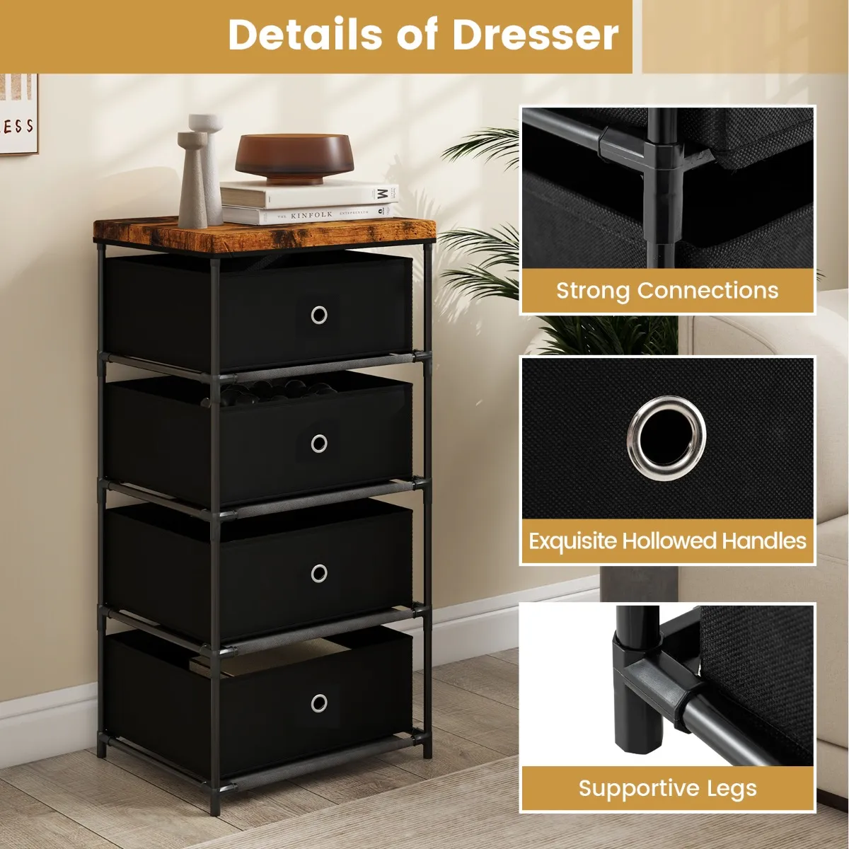 Deze opberglade zal je levenskwaliteit aanzienlijk verbeteren en je kamer vrij van rommel houden. 4 laden en een breed oppervlak bieden veel opbergruimte voor kleding, brillen, lampen, boeken en andere voorwerpen. Het stabiele metalen frame biedt betrouwbare ondersteuning. De van non-woven gemaakte laden zijn niet alleen eenvoudig op te vouwen, maar ook bestand tegen slijtage en zijn daardoor perfect geschikt voor langdurig gebruik. Het lijdt geen twijfel dat deze ladetoren ideaal is voor slaapkamers, woonkamers, gangen en kleine appartementen. Met zo’n praktische organizer bij de hand, waar wacht je nog op? Bestel nu.