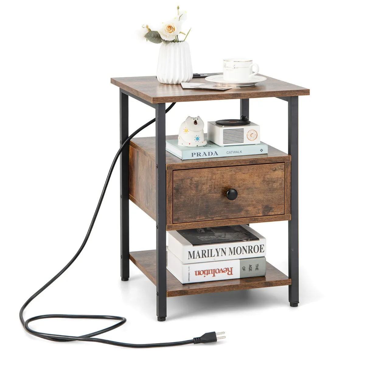 Dit elegante nachtkastje heeft 2 open vakken en een lade met handgrepen. Op het ruime bovenblad kun je een afstandsbediening, een lamp of een kleine potplant kwijt. Het is ook een handig oplaadstation met 2 stopcontacten, 1 Type-C poort en 2 USB-poorten voor het opladen van al je elektronische apparaten, of het nu een telefoon of een tablet is. Met het grote netsnoer kun je het aansluiten op een stroombron. Deze multifunctionele bijzettafel voegt zeker industriële charme toe aan je slaapkamer, woonkamer of kantoor.