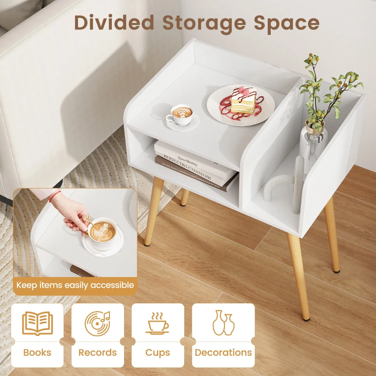 【Slanke metalen poten】: Vertrouw erop dat je spullen door stevige metalen poten worden gedragen, die betrouwbare, duurzame ondersteuning bieden voor de inhoud van je bijzettafel. De verstelbare voetkussens kunnen de tafel aan oneffen vloeren aanpassen.