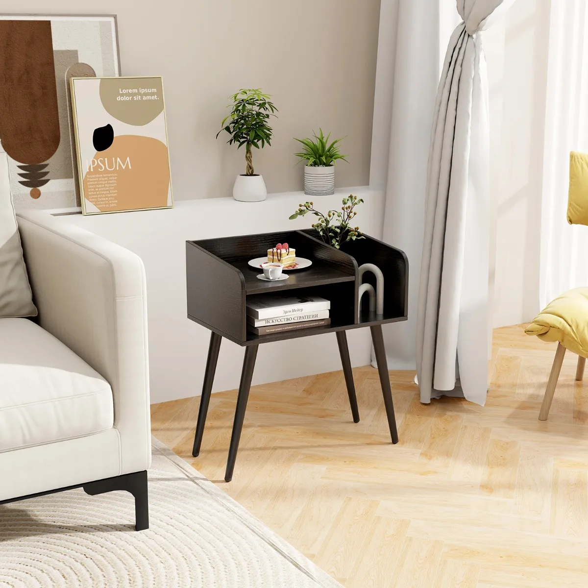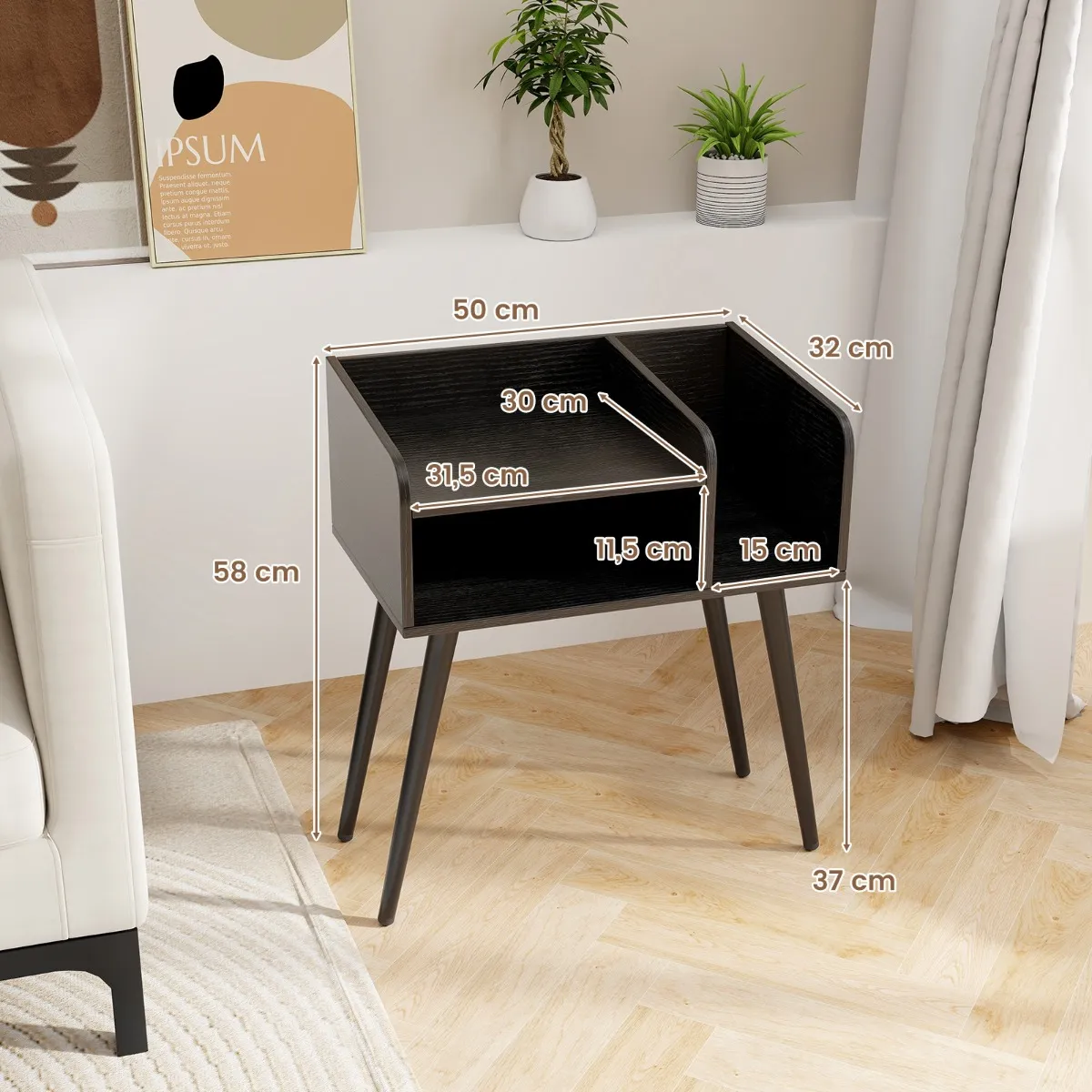 Geef je nachtelijke oase met dit ultramoderne nachtkastje net dat beetje extra, dat zowel vorm als functie combineert. Verras je over de royale opbergruimte in twee niveaus en het elegante zijrek, dat moeiteloze organisatie en gemakkelijke toegang tot je benodigdheden belooft. Maak je zorgen over de reiniging? Je zult dol zijn op het verhoogde ontwerp, dat het vegen vergemakkelijkt en je kamer onberispelijk houdt. Sterke, slanke metalen poten bieden een stabiele grip en passen zich moeiteloos aan oneffen vloeren aan met verstelbare kussens. Bovendien zorgen veilige, afgeronde hoeken en valbestendige randen voor je veiligheid, terwijl ze de chique stijl van je slaapkamer benadrukken. Duik in de Mid-Century charme – dit nachtkastje is niet alleen meubels, maar een lifestyle-upgrade.