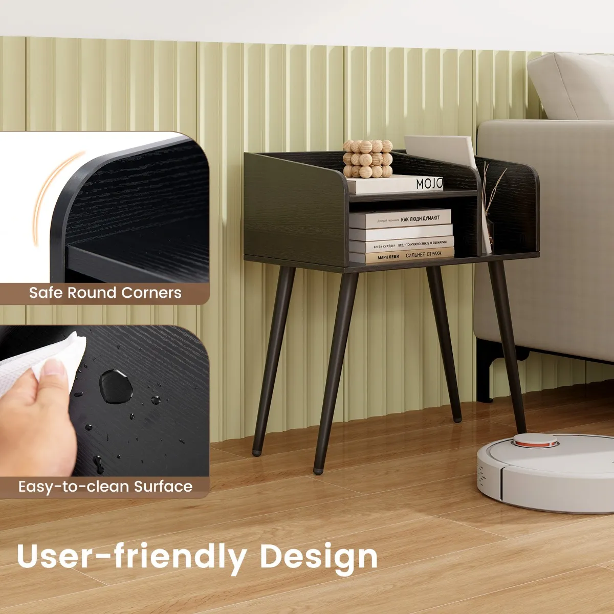 【Gebruiksvriendelijke designdetails】: Ervaar de doordachte details van deze bijzettafel, die is uitgerust met valbestendige randen en veilige, afgeronde hoeken voor een mix van veiligheid en stijl, die de decoratiestijl van je slaapkamer benadrukt.