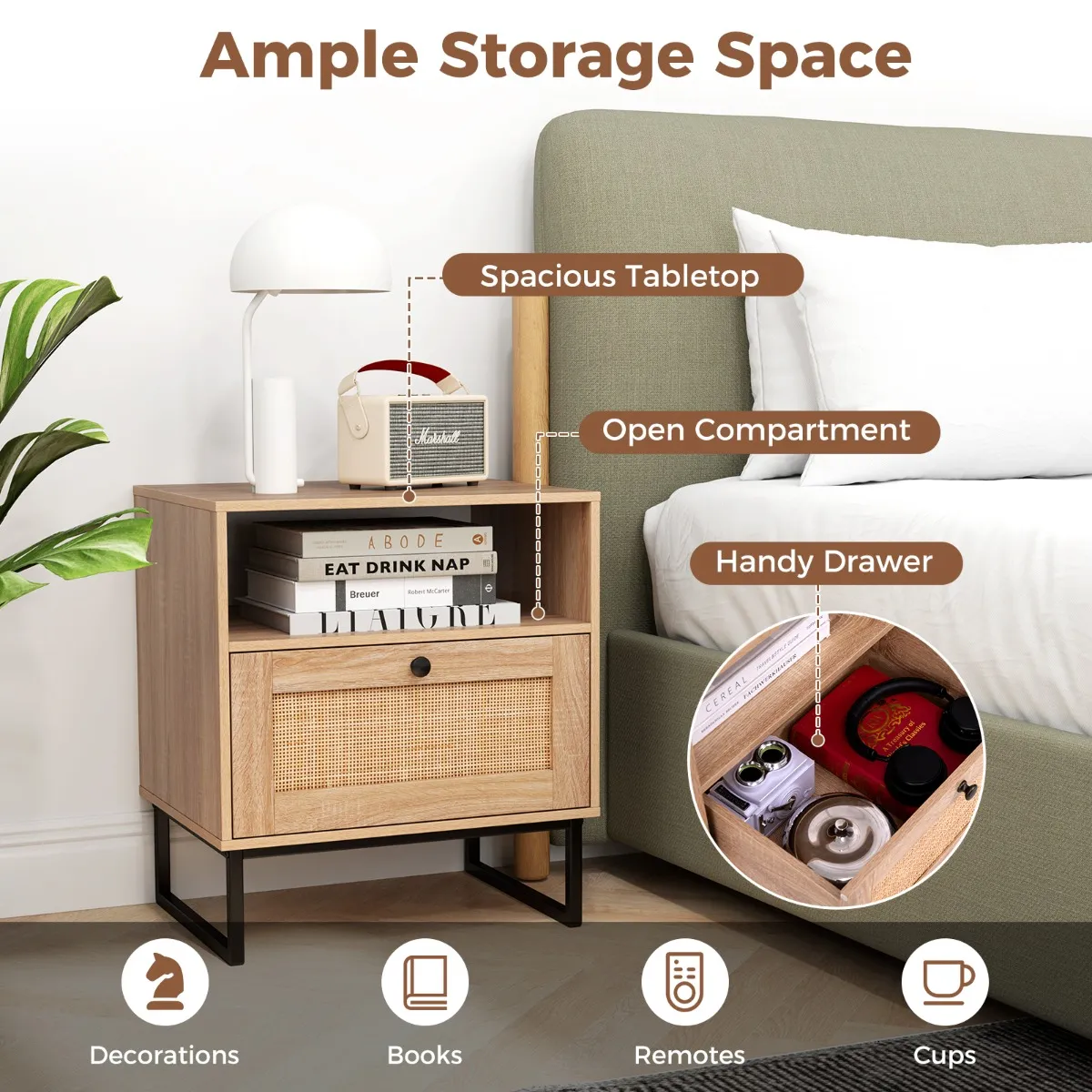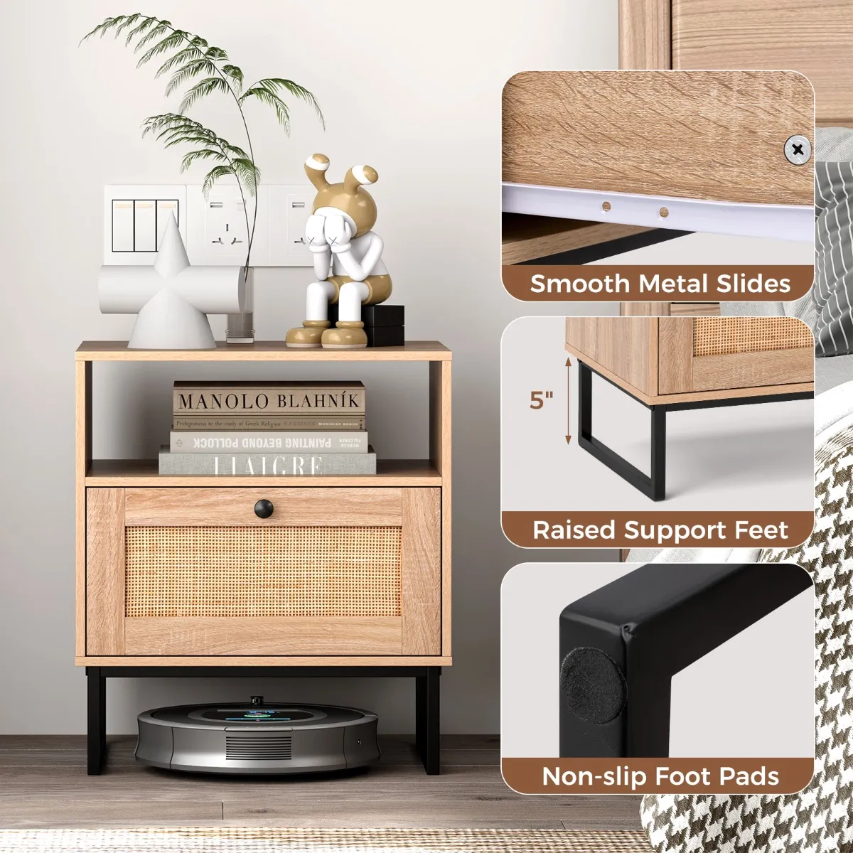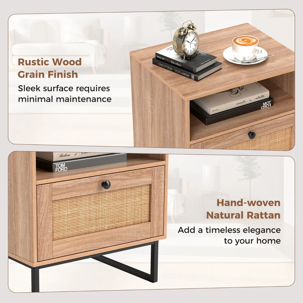 【Modern en Boheems】: Dit nachtkastje van rotan heeft een rustieke houtnerf-afwerking en handgevlochten rotan, waardoor de esthetiek van het moderne midden van de vorige eeuw wordt gecombineerd met een vleugje Boheemse stijl voor een stijlvolle en veelzijdige look.