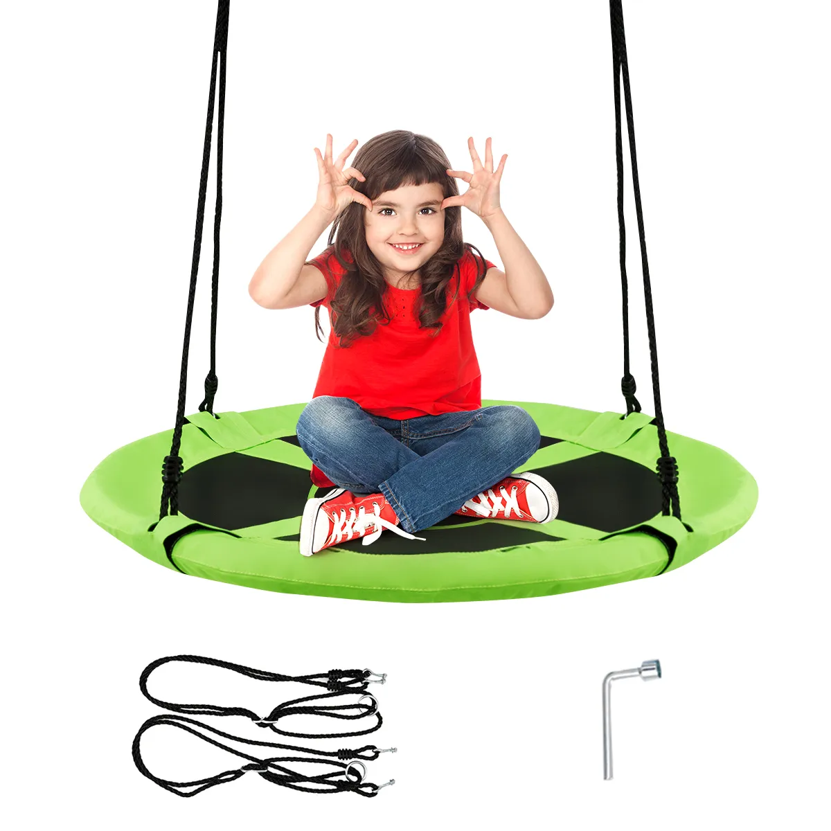 De tuinschommel ziet er modern, mooi en stabiel uit. Met praktisch ontwerp is de kinderschommel opvouwbaar. Als je de nestschommel wilt opbergen, neemt de platenschommel weinig ruimte in beslag. De hoogwaardige materialen garanderen een goede kwaliteit en een lange levensduur van de schommel. De ronde schommel is geweldig speelgoed voor de kinderen en zal u en uw kinderen aan het lachen maken.