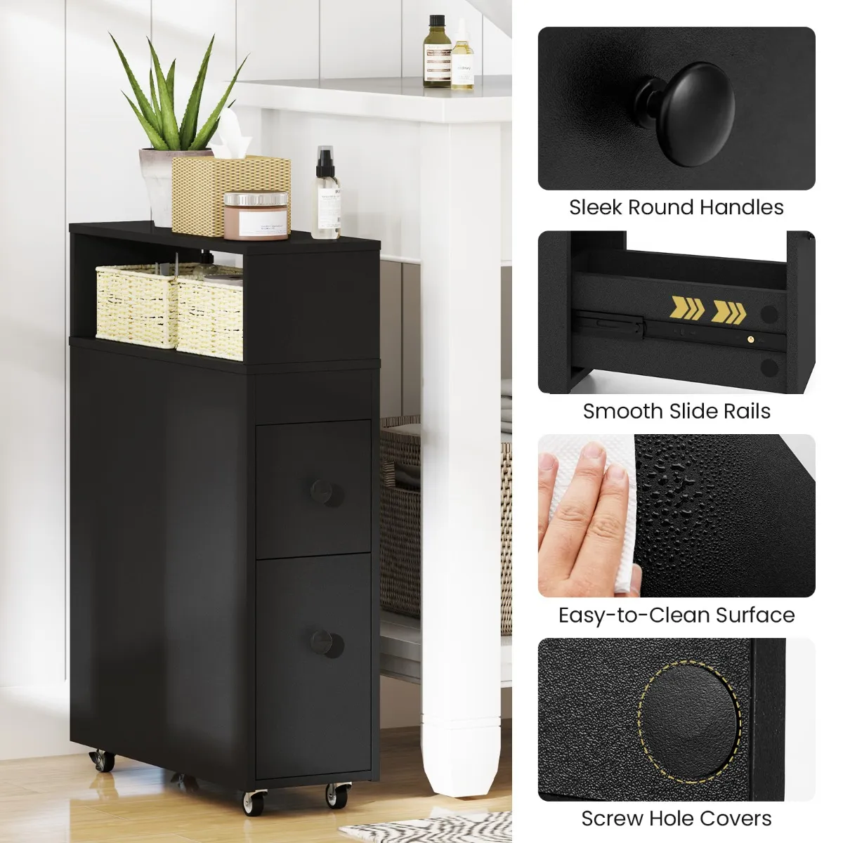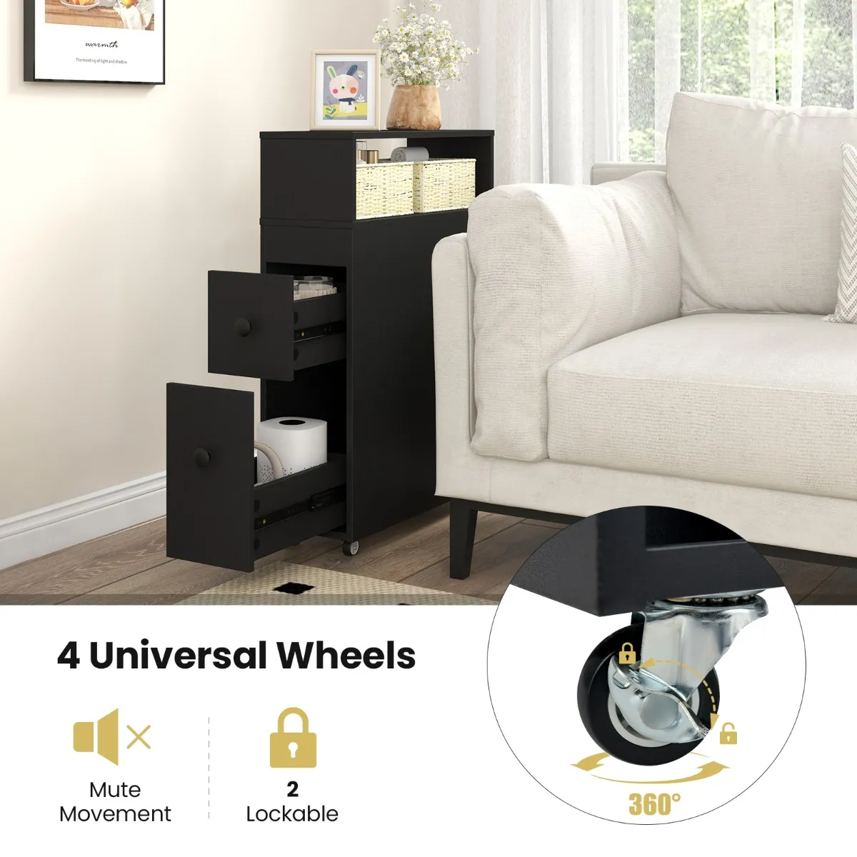360° draaibare wielen, gemakkelijk te verplaatsen in badkamer, keuken, woonkamer