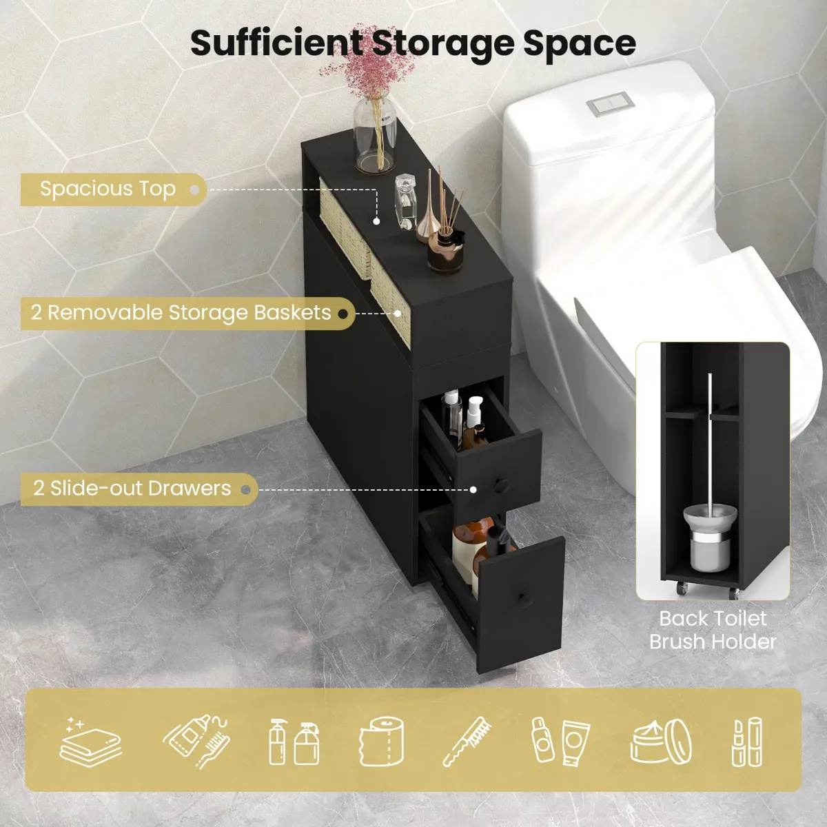 Voldoende opbergruimte voor toiletpapier, toiletartikelen en badkamerreinigers