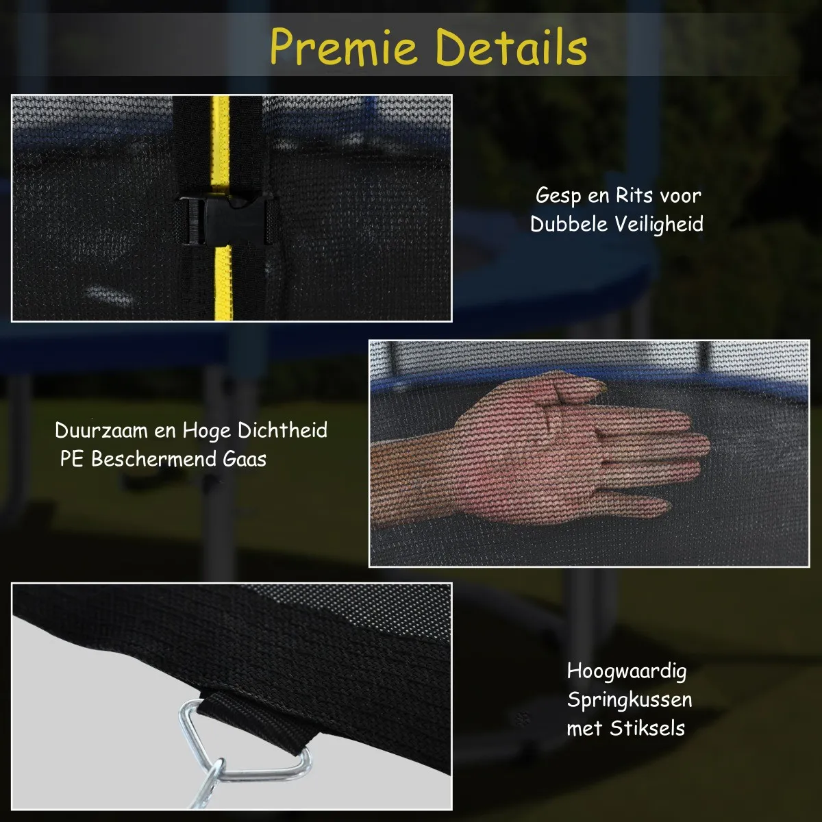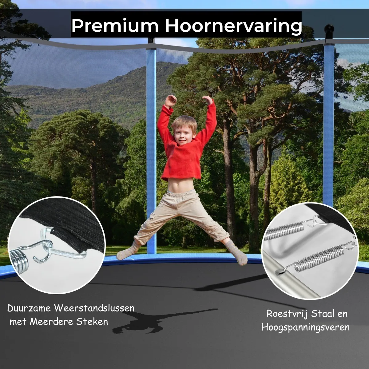 Met veiligheidsnet : Het veiligheidsnet binnenin scheidt het springgebied van de veren, zodat de kinderen zich er niet aan kunnen verwonden. Het houdt ze ook weg van de palen. Het is in totaal 180 cm hoog.
