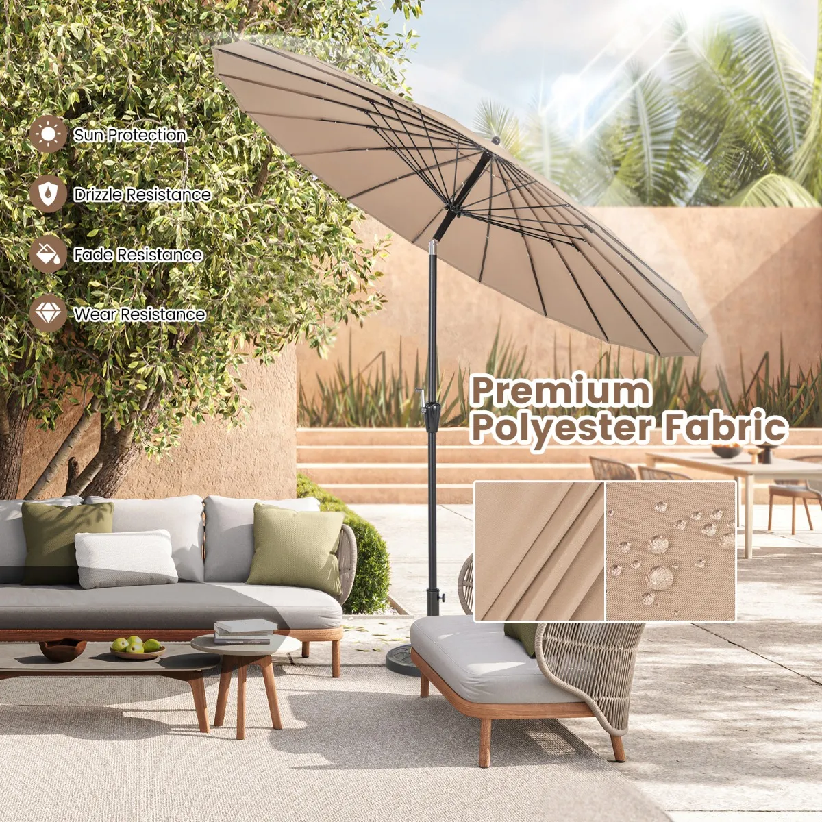 【Verbeterde stabiele structuur】: Ondersteund door een solide frame van 18 glasvezelribben biedt de terrasparasol uitstekende windbestendigheid. Bovendien kenmerkt de lichtgewicht aluminiumstang zich door zijn roestbestendigheid, om stabiliteit en langdurig gebruik te garanderen.
