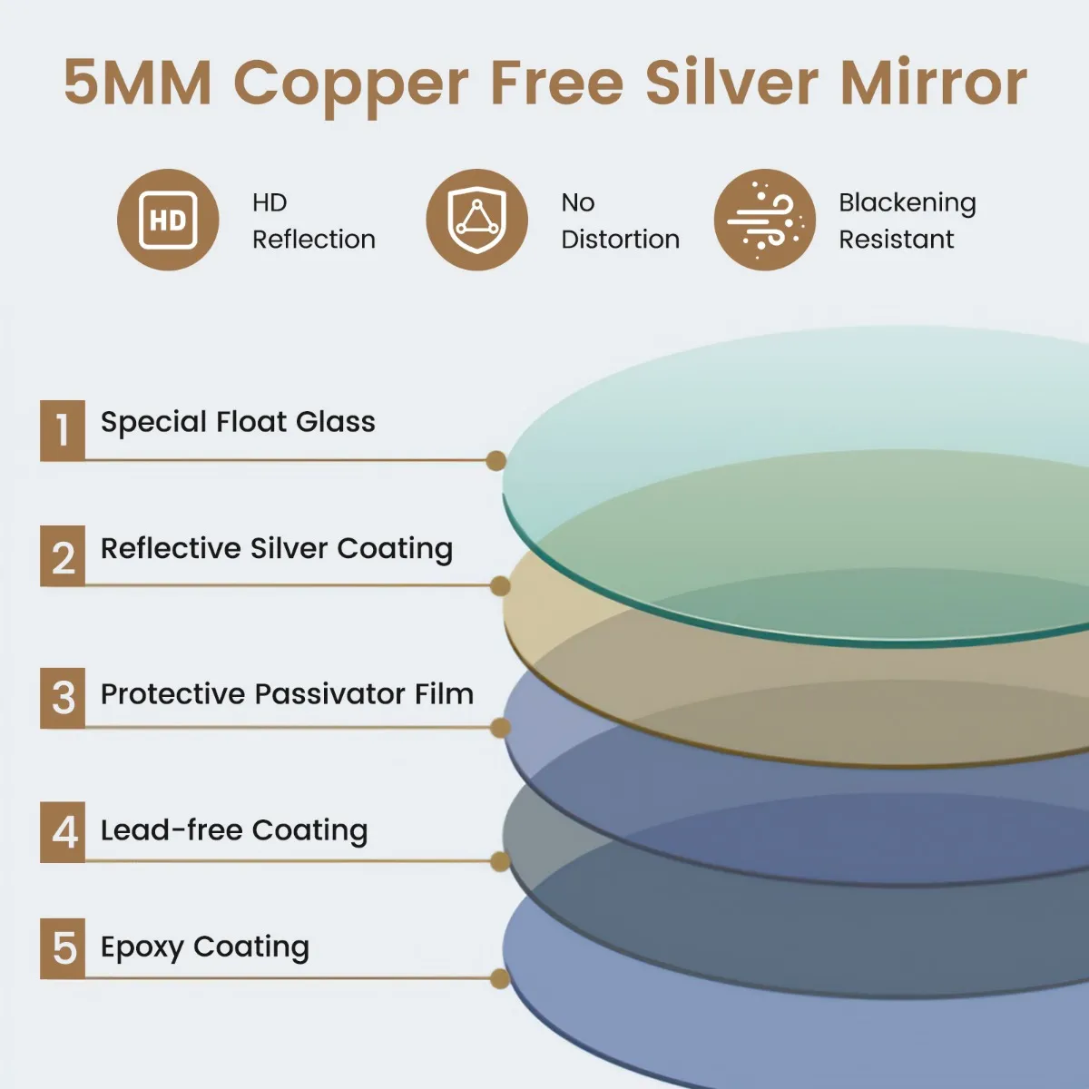 【HD Reflectie】: De spiegel is gemaakt van een 5 mm kopervrije zilveren spiegel en biedt een uitzonderlijke beeldkwaliteit zonder kleurzweem of vervorming. De spiegel is zeer goed bestand tegen donker worden en blijft helder, zelfs na langdurig gebruik.