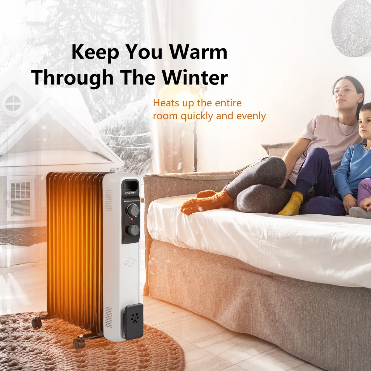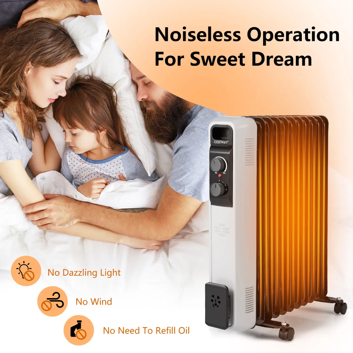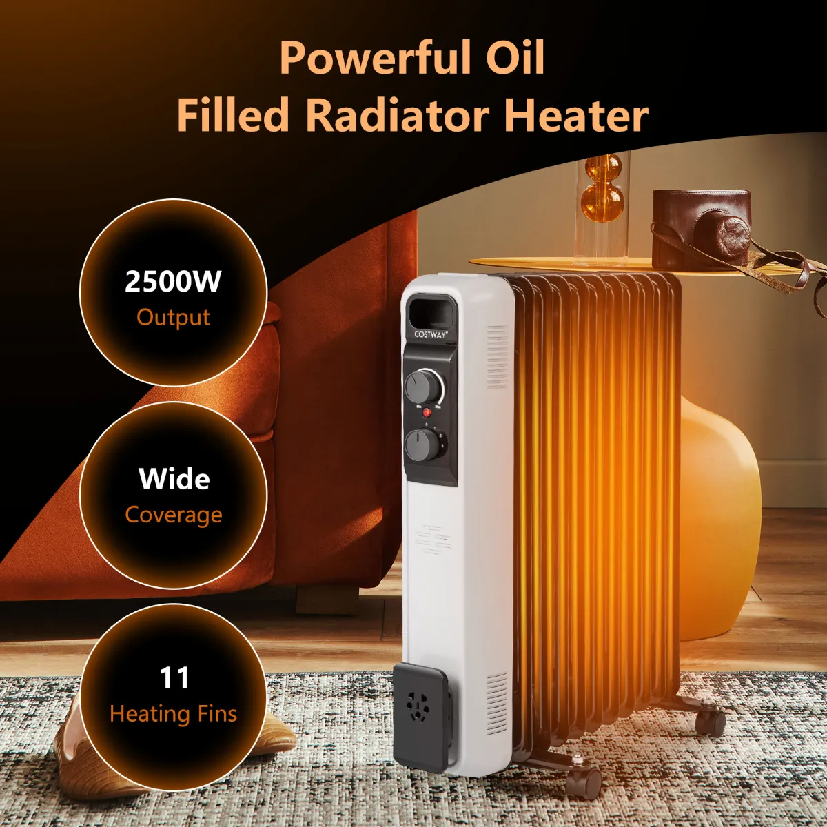 Houd jezelf en je geliefden warm in de winter met onze oliegevulde radiator! Deze oliegevulde radiator heeft 3 warmtestanden (1000 W/1500 W/2500 W) met een instelbare temperatuur tot 85 ℃, die eenvoudig kan worden aangepast door aan de bedieningsknoppen te draaien, afhankelijk van de situatie. De intelligente thermostaat kan de omgevingstemperatuur op uw instelling houden, wat voorkomt dat de temperatuur te hoog wordt en tot hoge energiekosten leidt. Zonder ventilatoren en zonder verblindende lichten biedt deze binnenverwarmer u een rustige omgeving terwijl u slaapt of werkt. Oververhitting en kantelbeveiliging houden u en uw gezin te allen tijde veilig. Verplaatsing is eenvoudig met universele wielen en draaggreep.