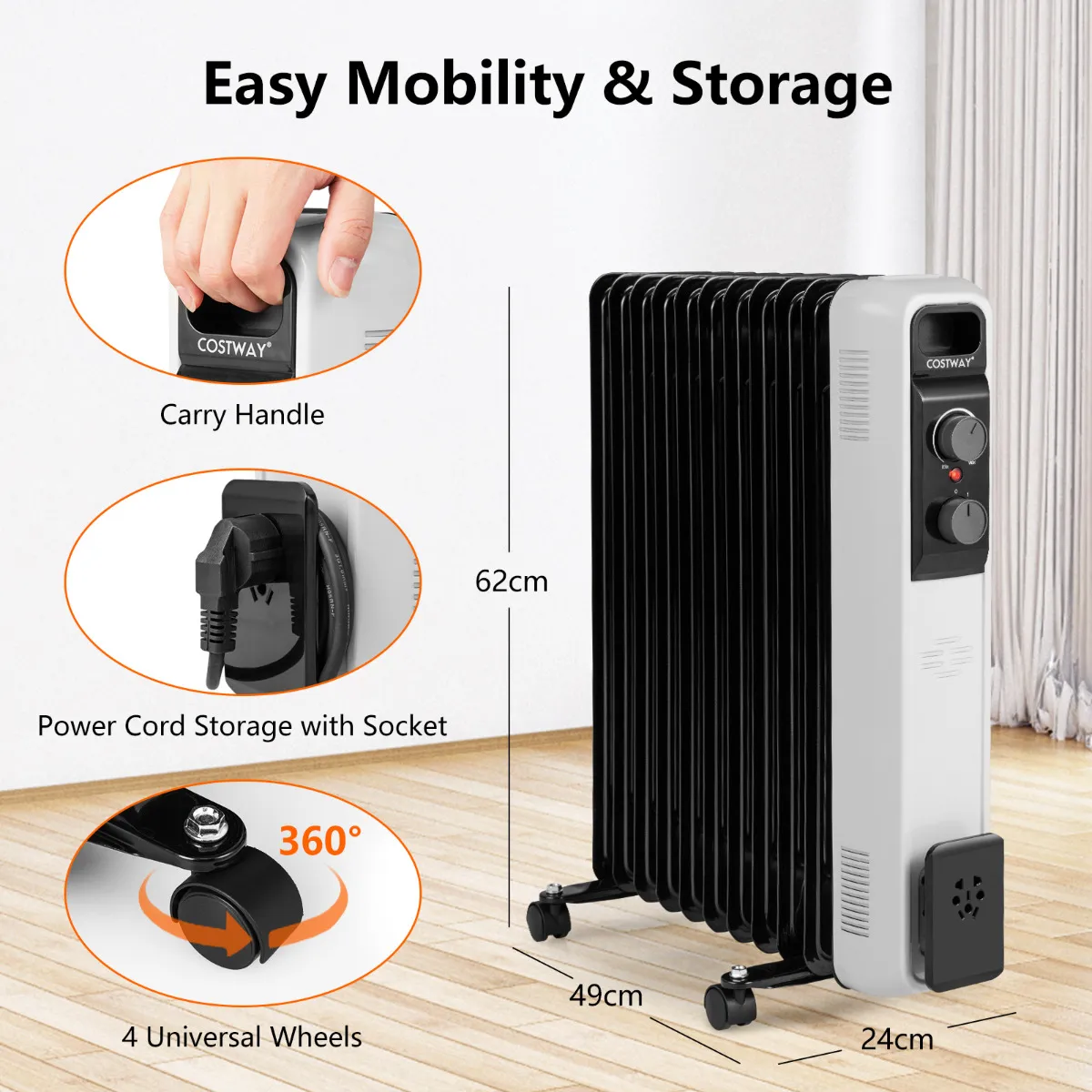 【Draagbare en praktische binnenkachel】 Deze binnenkachel op olie is uitgerust met 4 universele wielen om hem moeiteloos van kamer naar kamer te verplaatsen. De draagbeugel helpt ook veel bij het beklimmen van trappen. En deze oliekachel wordt geleverd met een opbergruimte voor het netsnoer met een stopcontact om de stekker goed op te bergen en uit de buurt van kinderen en huisdieren te houden.