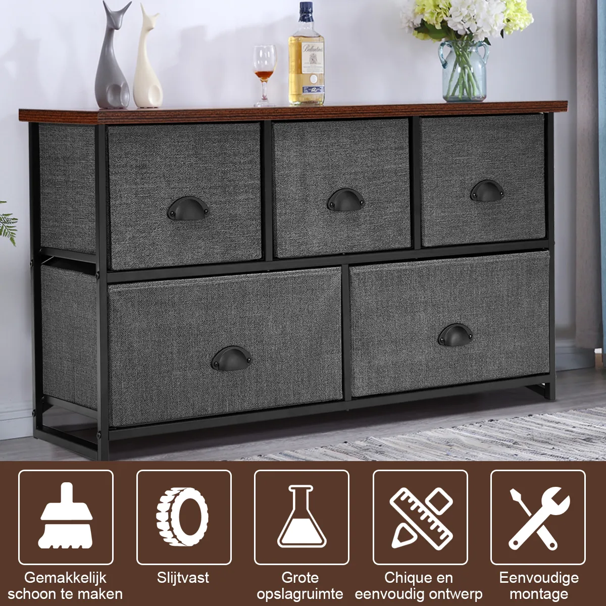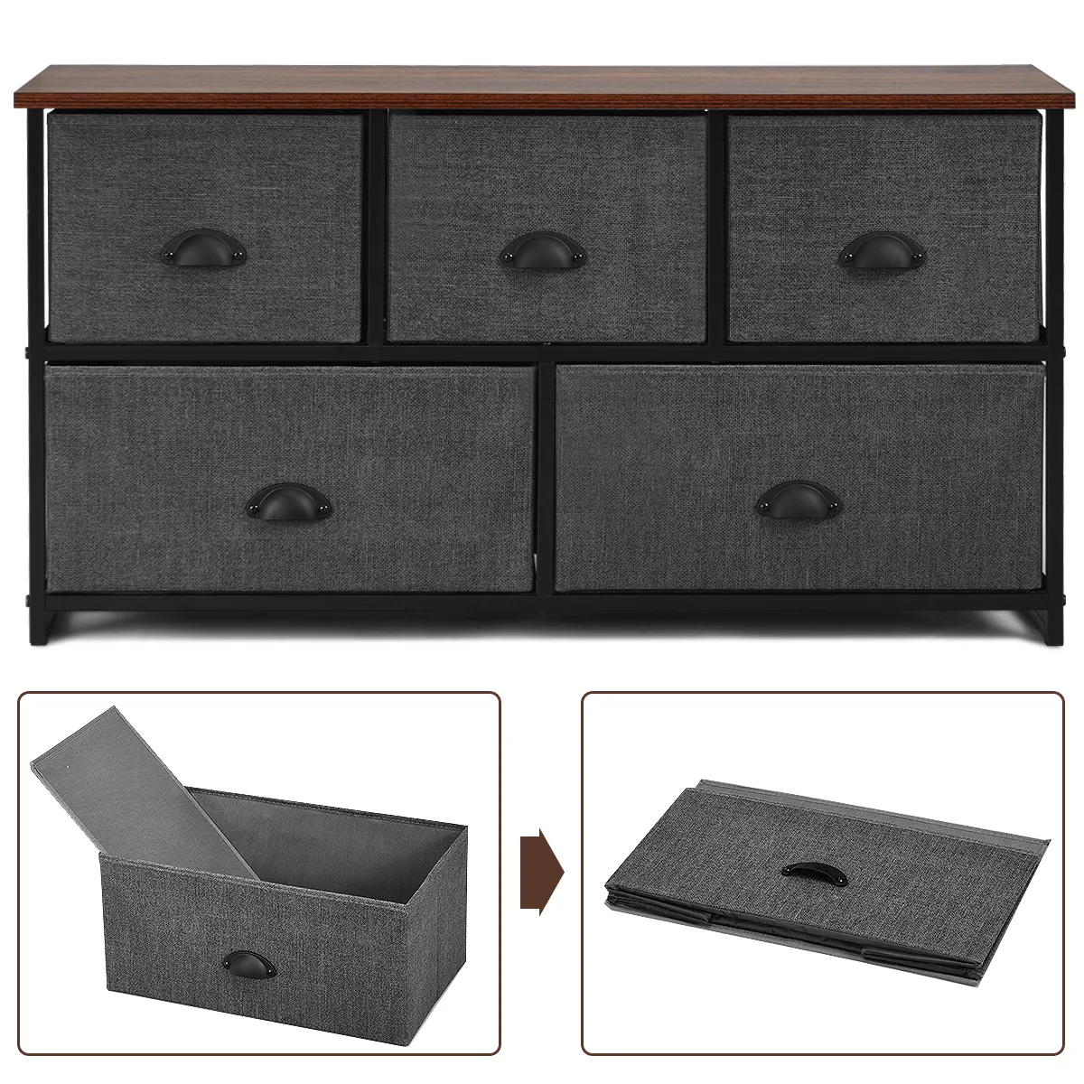 Gemaakt van stevig en duurzaam ijzeren frame en dik vezelplaat van gemiddelde dichtheid, is deze lade-opslageenheid solide genoeg om lang mee te gaan. Deze ladekast wordt geleverd met 5 opvouwbare stoffen bakken, waardoor je veel opbergruimte hebt. Bovendien zal de lade van zachte stof uw artikel niet beschadigen. Ideaal voor trainingsspullen, leggings, yogabroeken, extra dekens en meer. Het is geweldig voor kasten, slaapkamers, badkamers, logeer kamers, kinderdag verblijven, speelkamers, entrees en meer.