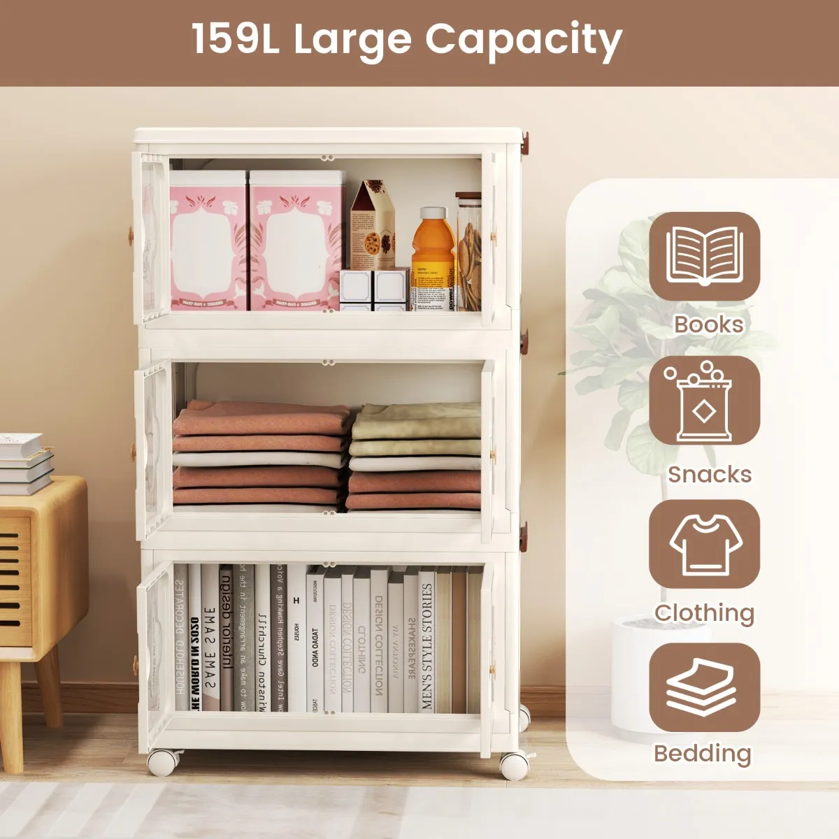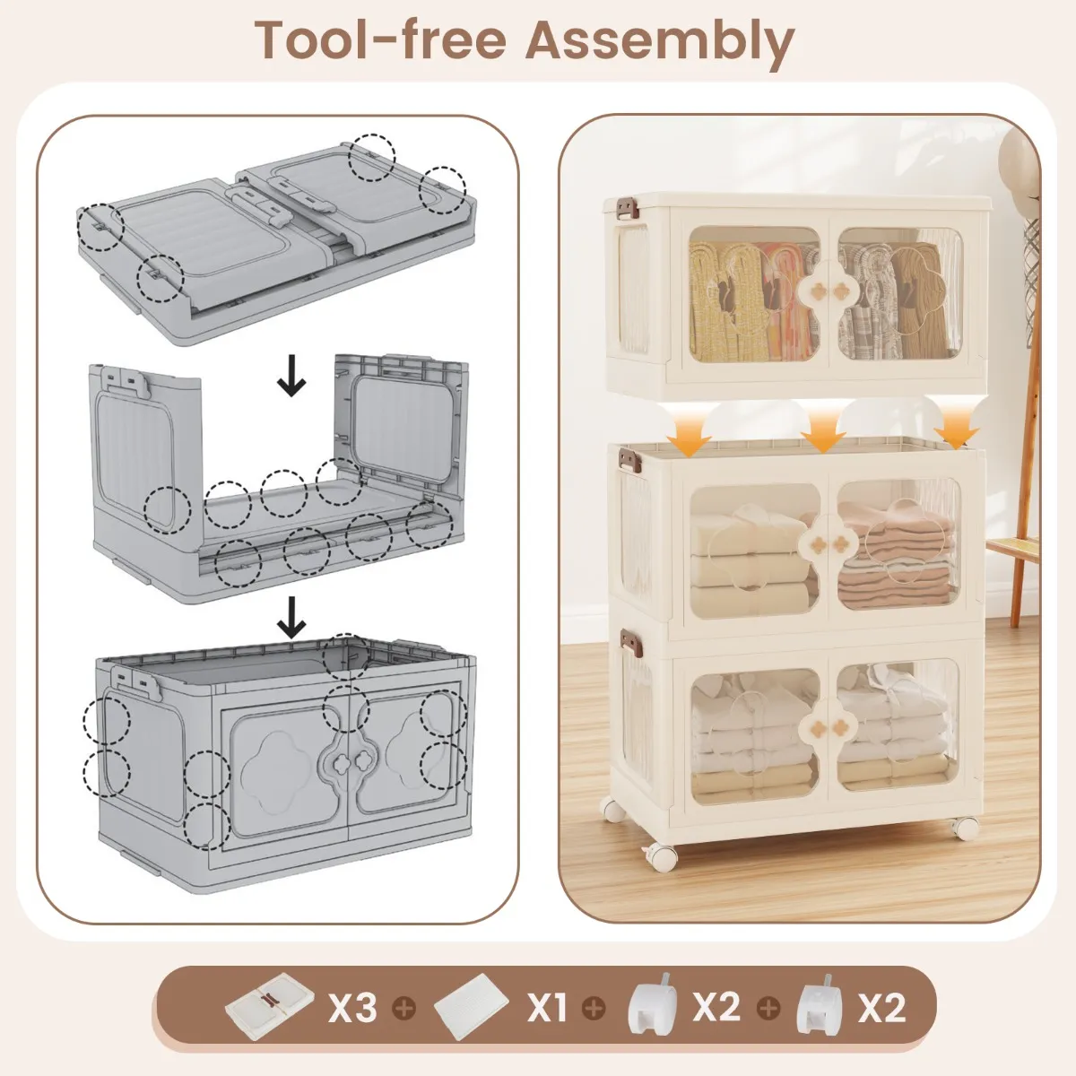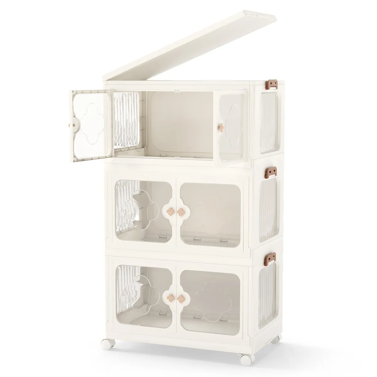 Onze chique opbergorganizer combineert formaat en functionaliteit en heeft een grote inhoud, perfect voor het opbergen van alles, van souvenirs tot essentiële spullen! Het is klaar voor gebruik, kan in een handomdraai zonder gereedschap in elkaar worden gezet, kan indien nodig plat worden opgevouwen en kan hoog worden gestapeld met veilige gespen aan de zijkanten. Dankzij de transparante deuren pakt u snel wat u nodig hebt en de magnetische sluitingen en klavervormige handgrepen houden uw spullen veilig. Dankzij de vergrendelbare en soepele wieltjes kunt u de wagen overal naartoe verplaatsen.
