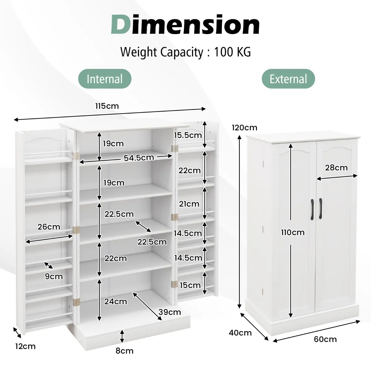Deze voorraadkast heeft 3 opberggebieden met in totaal 17 planken en biedt voldoende opbergruimte voor serviesgoed, keukengerei, kruidenpotjes en snacks. Zelfs de zijplanken zijn voorzien van metalen stangen om te voorkomen dat voorwerpen omvallen. Dankzij het multifunctionele ontwerp kan hij worden gebruikt als keukenkast, kledingorganizer of presentatiestandaard. Het vermeldenswaard is dat de voorraadkast een modern en elegant uiterlijk heeft, waardoor hij past bij elke interieurstijl. De kantelbeveiliging geeft hem ook extra stabiliteit. Daarom is onze voorraadkast een veelzijdige toevoeging om opbergruimte uit te breiden in de eetkamer, keuken, woonkamer, entree en pauzeruimtes.