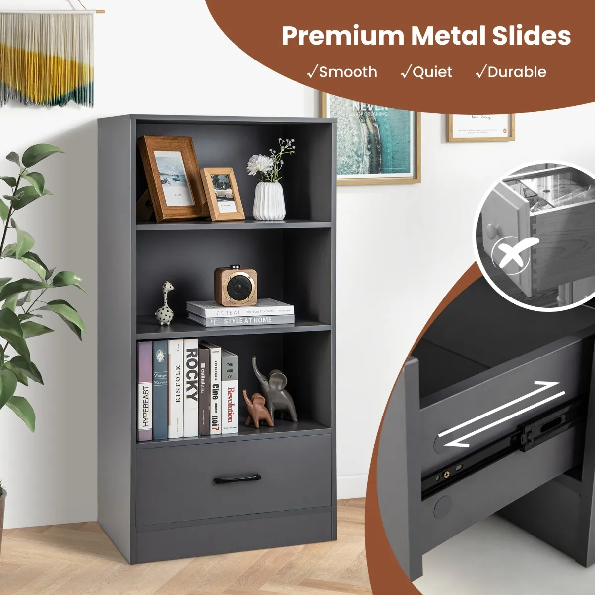 Dan zal dit opbergrek met 4 niveaus aan uw wensen voldoen! Drie grote opbergvakken en een lade voor persoonlijke spullen voldoen aan uw dagelijkse opbergbehoeften. Hoge kwaliteit MDF en sterke verbindingen zorgen voor een uitstekend draagvermogen. Bovendien kan de betrouwbare kantelbeveiliging het magazijnrek ook tegen omvallen beschermen. Je kunt dit opbergrek op verschillende plekken gebruiken, b.v. B. op kantoor, woonkamer of studeerkamer.