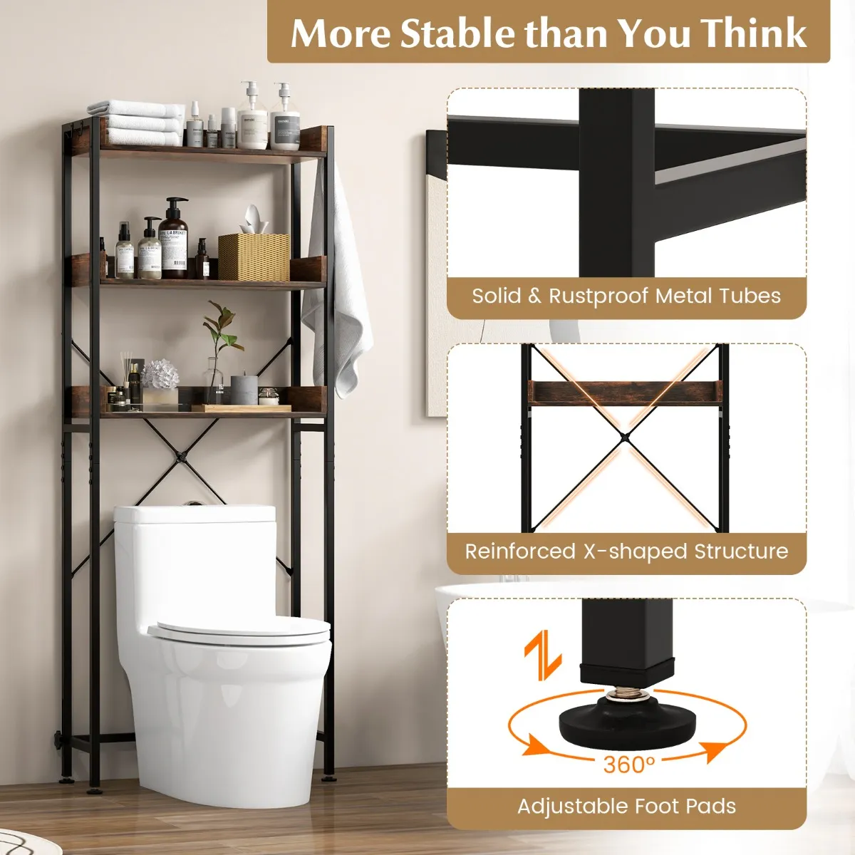 Dit opbergrek voor boven het toilet wordt geleverd met 3 open planken en 4 haken en biedt ruime opbergruimte voor je badkamerbenodigdheden. Het kan gebruikt worden in de bijkeuken om je schoonmaakproducten op te bergen of als plantenstandaard op het balkon. De onderste stang kan in hoogte worden versteld voor verschillende toiletten. Ontworpen met dikke planken, metalen buizen, X-vormige metalen stangen, verstelbare voetsteunen en 2 anti-kantelvoorzieningen, biedt het een uitstekende stabiliteit en duurzaamheid.