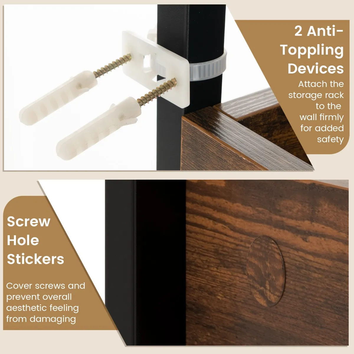 Veilig, responsief ontwerp: 2 anti-kantelvoorzieningen worden meegeleverd om het opbergrek stevig aan de muur te bevestigen voor extra veiligheid. Bovendien wordt het rek geleverd met stickers om de schroefgaten af te dekken en de algehele esthetiek te verbeteren.