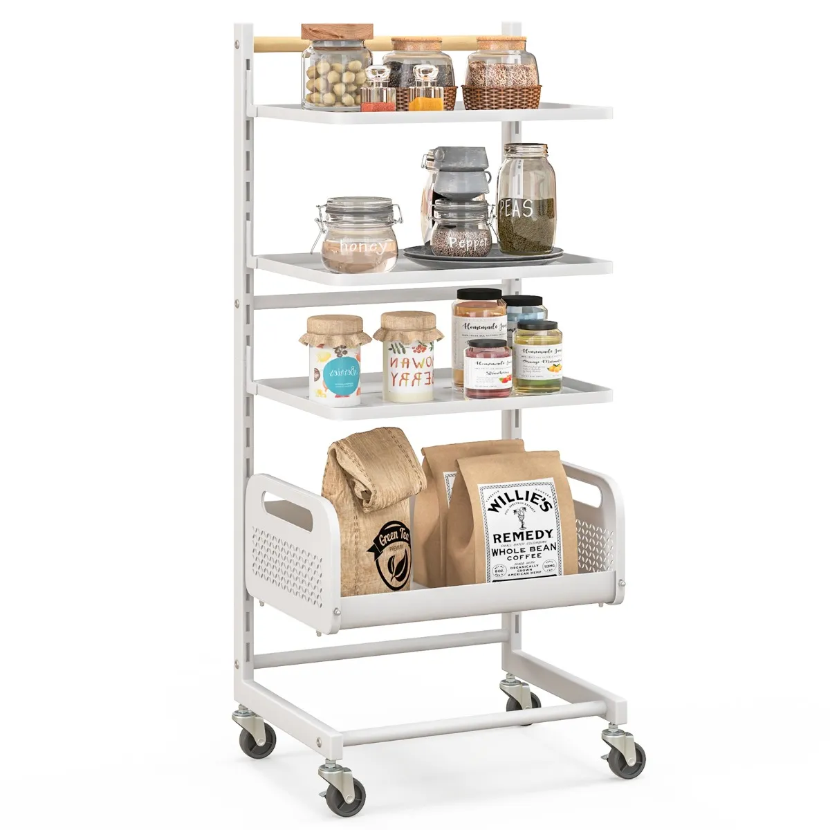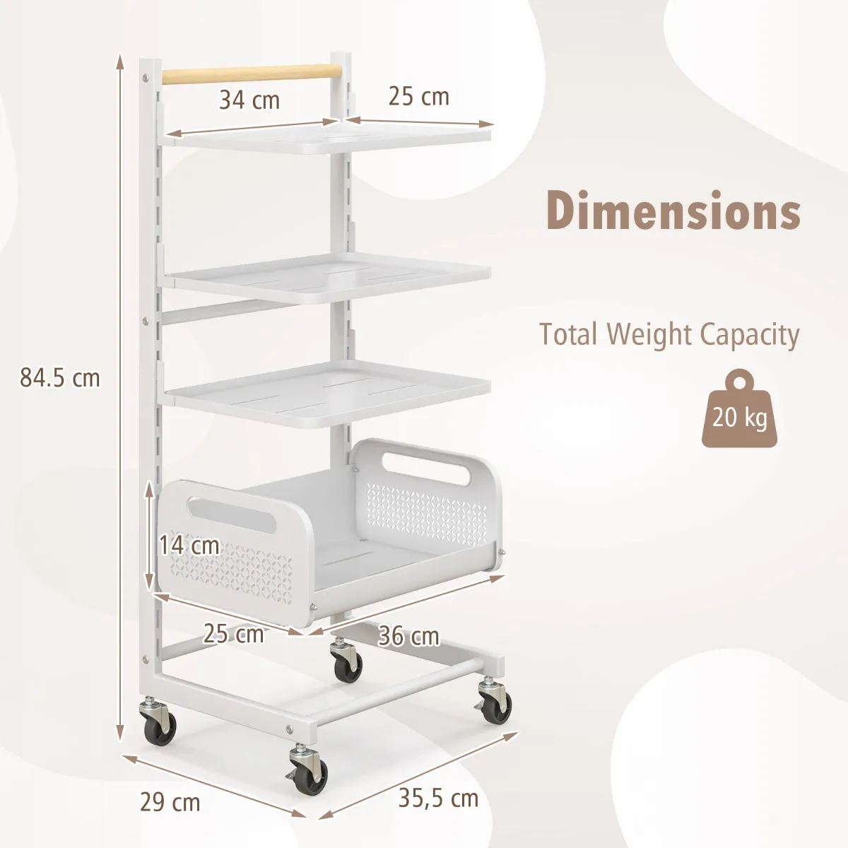 Verbeter je opbergoplossingen met deze metalen trolley op wieltjes met 4 verdiepingen. Met afneembare en verstelbare planken biedt deze trolley flexibele opslag voor spullen van verschillende hoogtes in je keuken, badkamer, woonkamer en nog veel meer. Hij is ook voorzien van een luchtdoorlatende gaasmand, waardoor bederf effectief wordt voorkomen en overtollige vloeistoffen gemakkelijk kunnen worden afgevoerd. Bovendien heeft de trolley 4 universele wielen voor moeiteloze verplaatsing, waarvan 2 vergrendelbaar voor een veilige plaatsing naar wens. Houd je spullen georganiseerd en gemakkelijk toegankelijk met deze praktische en functionele trolley.