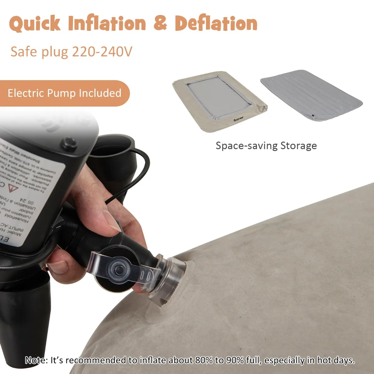 Deze draagbare opblaasbare mattenset voor kinderen bevat een elektrische pomp met 3 onderling verbonden sproeiers voor snel oppompen, een handige opbergtas voor moeiteloos transport en een set reparatiepleisters om eventuele ongelukjes op te vangen. Het afneembare dubbelzijdige matras biedt veelzijdigheid: de ene kant heeft een zacht gevlokt oppervlak dat aangenaam aanvoelt en de andere kant is gemaakt van zeer sterk PVC, geschikt om mee te spelen. Of het nu gebruikt wordt in een kinderkamer, als logeerbed of meegenomen wordt op reis, het biedt betrouwbare ruimte.