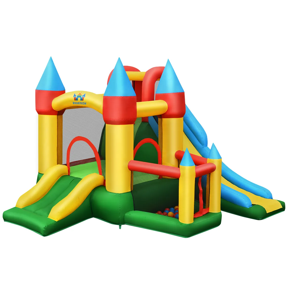 【Veelvoudige speelgebieden】Ons opblaasbare springkasteel kenmerkt één ingebouwde trampoline, twee glijbanen, oceaanballen bad, het beklimmen muur en basketbal velg, die uw kinderen verschillende pret geeft om met te spelen. Ondertussen, is de totale gewichtscapaciteit van dit opblaasbare springkussen 135 kg (Suggestie: het gewicht van elk kind zou onder 45 kg moeten zijn).