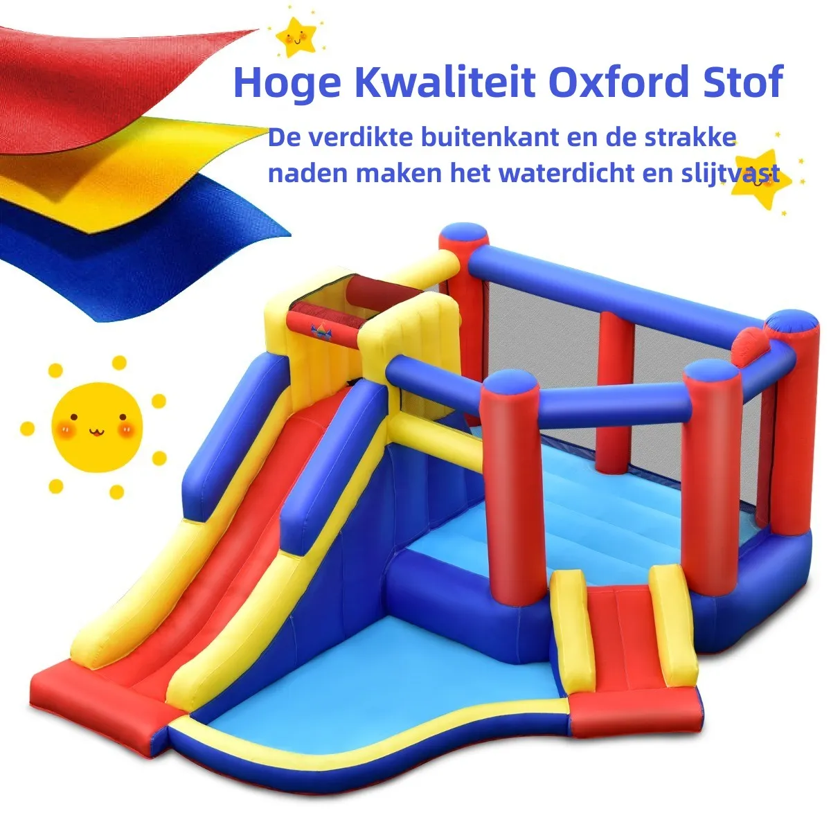Springen, glijden en spelen, uw kleintje zal de ene na de andere gelukkige dag doorbrengen in het reusachtige opblaasbare springkussen! Het springkussen bestaat uit een verscheidenheid aan entertainment elementen, waaronder 2 glijbanen, een ballenbak, een springplaats, een basketbal hoepel en een klimwand, verrukken kinderen en hun vriendjes in de feestjes. Door de omringende gaaswanden kunt u ze binnen in de gaten houden in verband met de veiligheid. En de lieve accessoires, zoals de draagtas, zorgen voor probleemloos opbergen en vervoeren. Daarom kunt u het springkasteel overal opzetten om plezier te hebben.