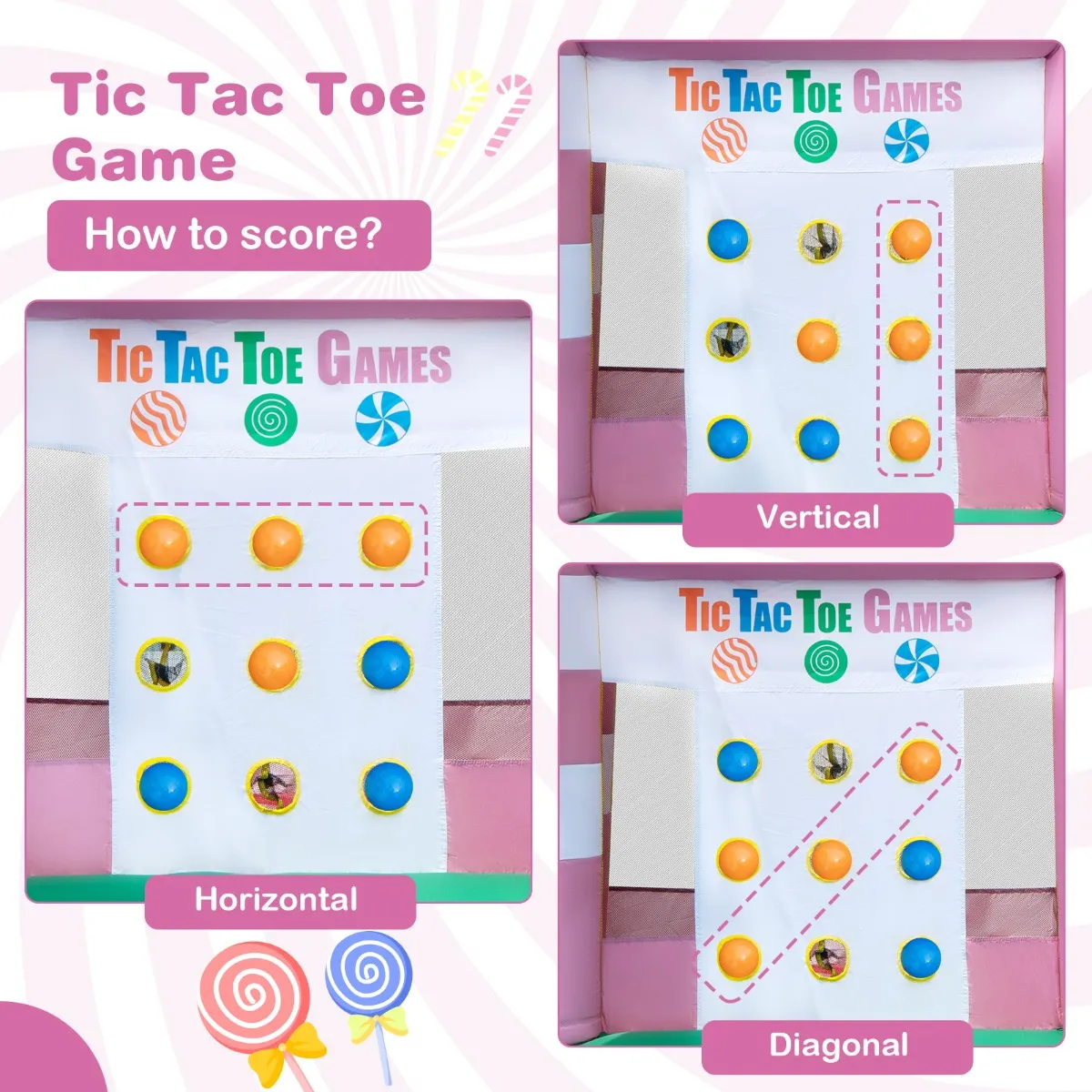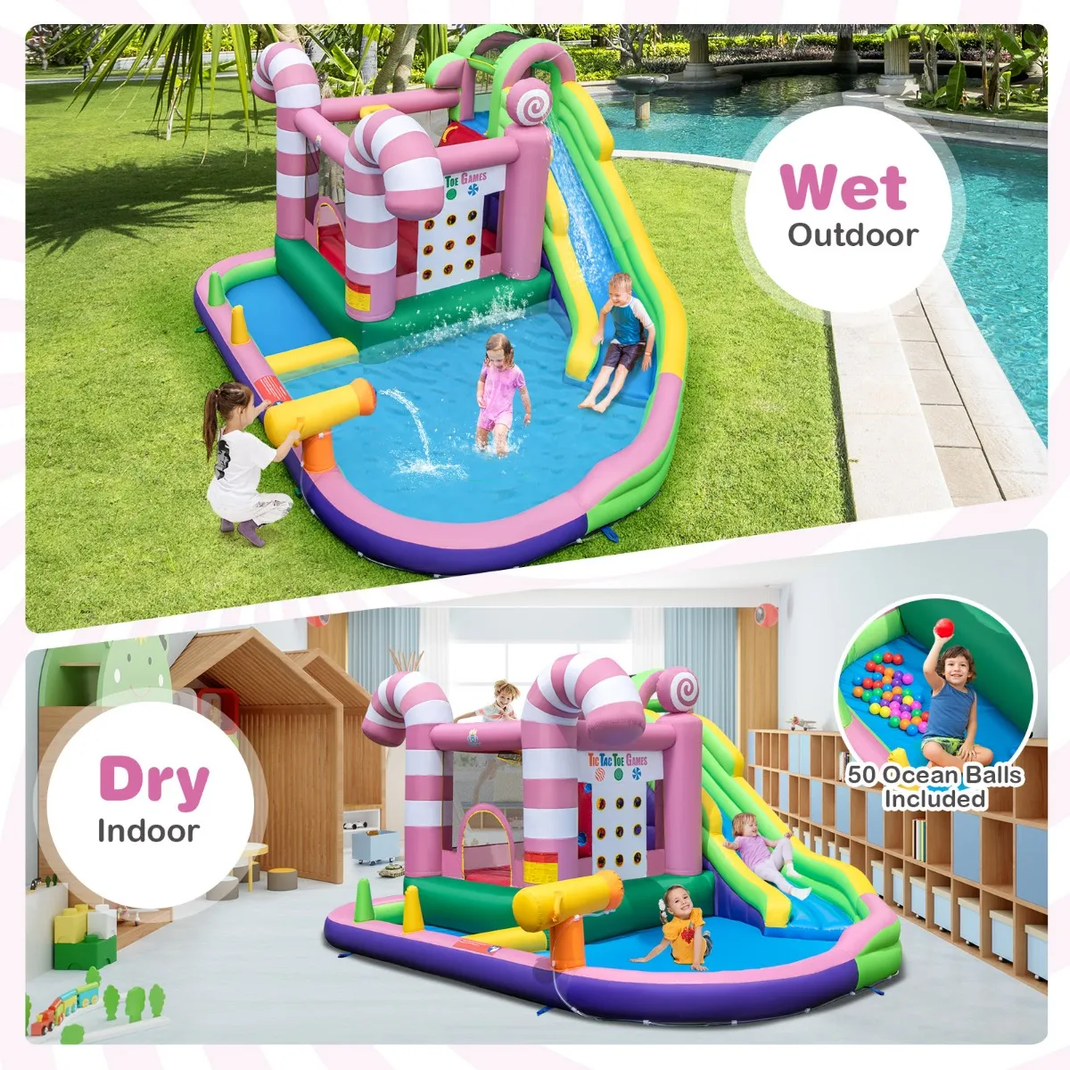 9-in-1 snoepthema waterpark : Het opblaasbare springkasteel met snoepdecoratie is ontworpen om kinderen eindeloos plezier te geven. Het combineert een lange waterglijbaan met een leuk springgebied, een klimwand, een groot peuterbad en een klein ballenbad, maar ook leuke spelletjes zoals basketbalhoepel, ringgooien, waterpistool en tic-tac-toe.