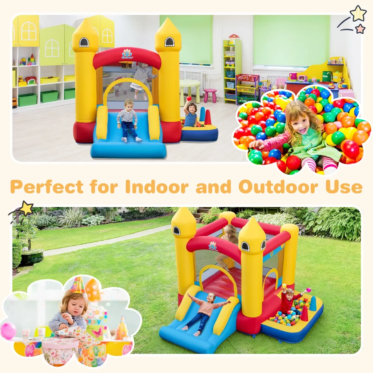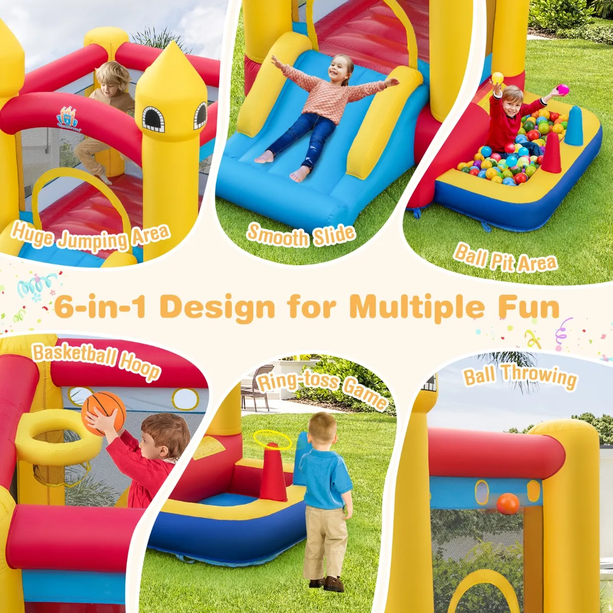 Dit opblaasbare springkasteel combineert meerdere speelgebieden met verschillende spelletjes om de aandacht van de kinderen te trekken en hen urenlang plezier te geven. Met glijbaan, springgebied, basketbalmand, ringworp en balworp zijn er genoeg mogelijkheden voor kinderen om een mooie middag buiten door te brengen. Bovendien kun je 50 meegeleverde speelballen gebruiken om het ballenbad of het springoppervlak voor extra plezier te vullen.