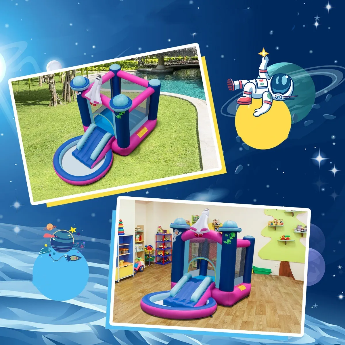 Als perfecte speeltoevoeging aan kinderfeestjes zal onze opblaasbare waterglijbaan erg populair zijn bij kinderen. Door het ruimteontwerp zien ze er schattiger uit dan traditionele waterglijbanen. Als kinderen in de waterglijbaan spelen, zullen ze zich in een ruimtecapsule wanen. Als het gevuld is met water, kunnen kinderen van het springkussen naar beneden glijden en het peuterbad in. Wat betreft de productkwaliteit, het is gemaakt van hoogwaardig oxford-weefsel en een dichte beschermende gaaswand. Er zijn verhoogde leuningen op de glijbaan. Alle functies zijn ontworpen voor een langere levensduur en meer veiligheid. Ten slotte kan de waterglijbaan tegelijkertijd plaats bieden aan 3 kinderen van 3-10 jaar. Het individuele gewicht is 45 kg en het totale gewicht is 135 kg. Het pakket bevat een leeggelopen waterglijbaan, een 480W-blazer, 8 grondpennen, een reparatieset en een draagtas.