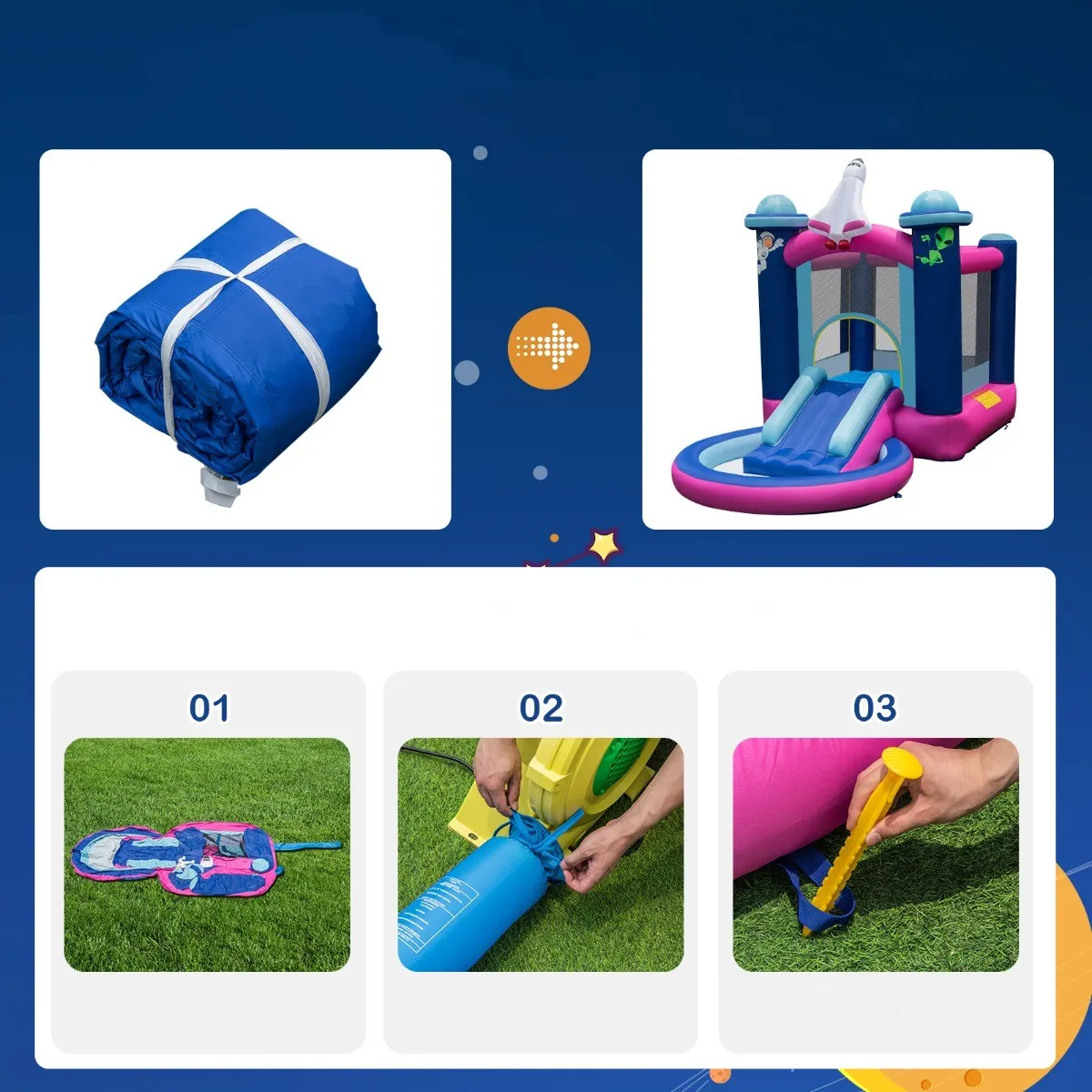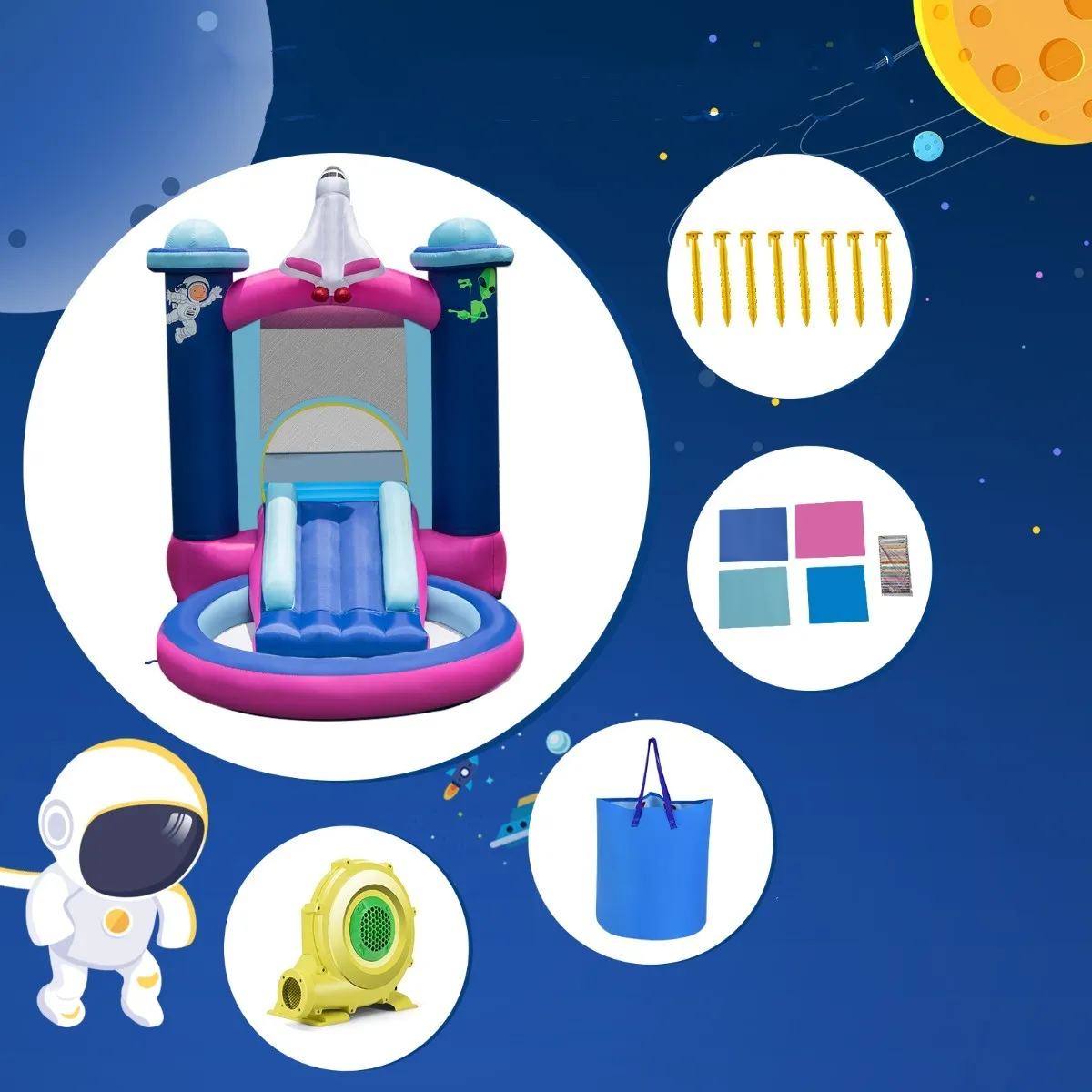 Ontwerp van de ruimte: De opblaasbare waterglijbaan met ruimtethema is een prachtige plek voor kinderen met ruimtedromen. De volledig opgeblazen positie geeft kinderen een gevoel van gewichtloosheid, net als astronauten in een capsule. De waterglijbaan is ook uitgerust met een opblaasbaar ruimteschip, waardoor rollenspellen realistischer worden.