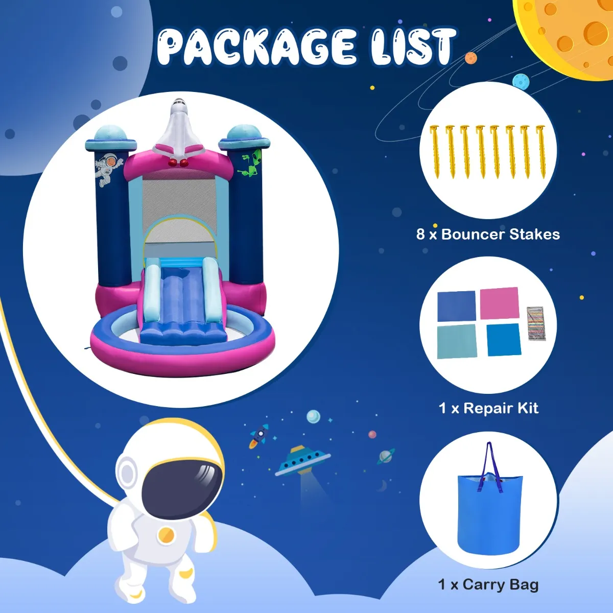 Als perfecte speeltoevoeging aan kinderfeestjes zal onze opblaasbare waterglijbaan erg populair zijn bij kinderen. Door het ruimteontwerp zien ze er schattiger uit dan traditionele waterglijbanen. Als kinderen in de waterglijbaan spelen, zullen ze zich in een ruimtecapsule wanen. Als het gevuld is met water, suizen kinderen van de glijbaan van de springmat naar het peuterbad. Wat betreft de productkwaliteit, het is gemaakt van hoogwaardig oxford-weefsel en een dichte beschermende gaaswand. Er zijn verhoogde leuningen op de glijbaan. Alle functies zijn ontworpen voor een langere levensduur en meer veiligheid. Ten slotte kan de waterglijbaan tegelijkertijd plaats bieden aan 3 kinderen van 3-10 jaar. Het individuele gewicht is 45 kg en het totale gewicht is 135 kg. Het pakket bevat een leeggelopen waterglijbaan, 8 grondpennen, een reparatieset en een draagtas. Een blower wordt echter niet meegeleverd en het aanbevolen vermogen is 480W.