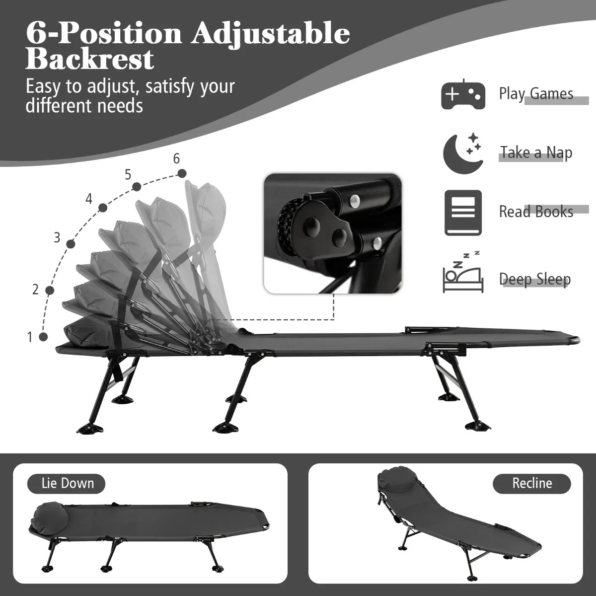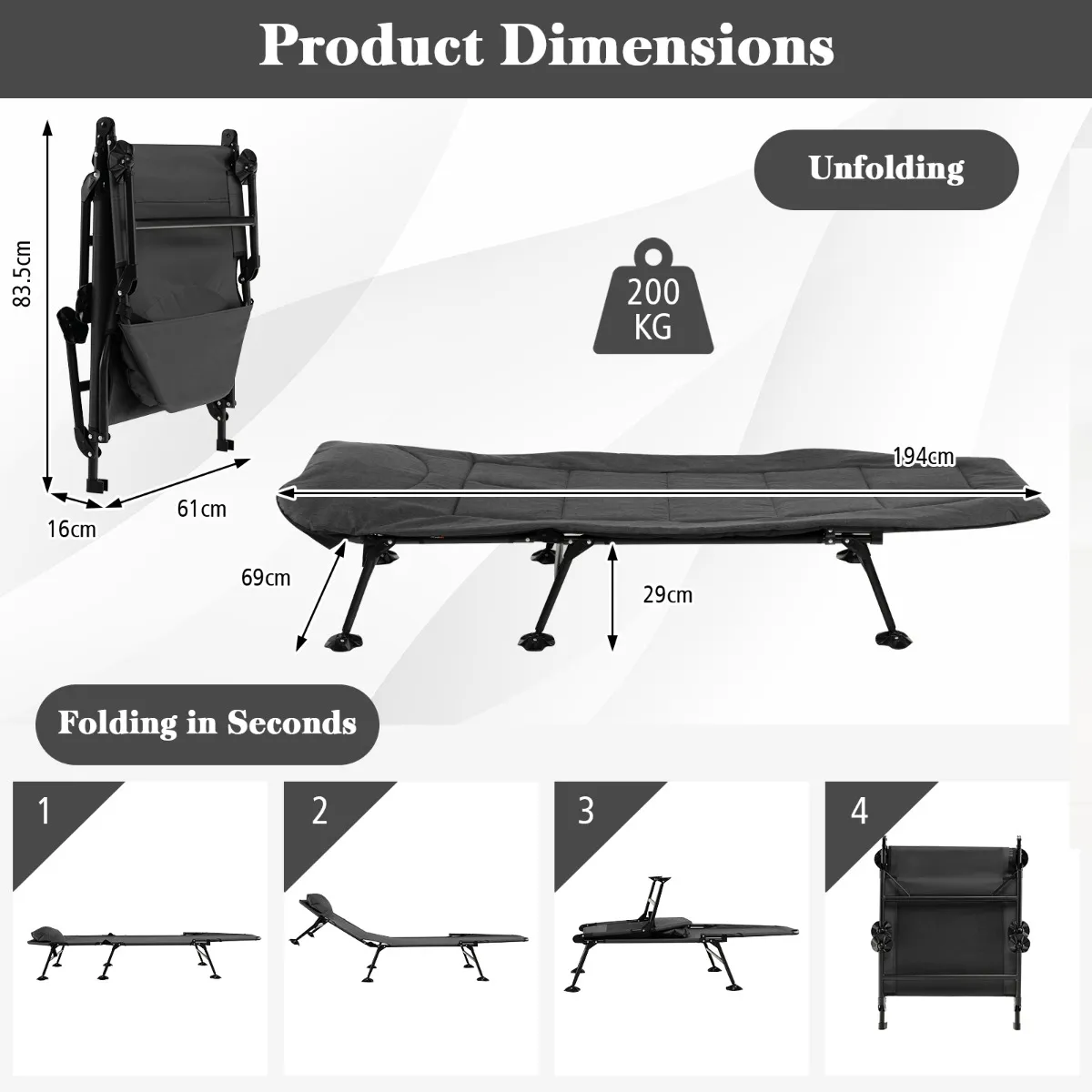 Ons opvouwbare campingbed meet 194 x 69 x 29 cm (L x B x H) en weegt 6,5 kg, wat perfect is voor uw buitenactiviteiten. Of u nu een dutje doet, aan het zonnebaden bent, op reis bent, metgezel bent in het ziekenhuis of naar kantoor gaat, het kan bij verschillende gelegenheden aan al uw behoeften voldoen. En de rugleuning is in 6 standen te verstellen waaruit je kunt kiezen. Het is gemaakt van duurzaam Oxford-materiaal en roestvrij gepoedercoat metaal, dat hoge sterkte, anti-vervorming en duurzaam is. En de stof is ademend om je koel te houden in warme en natte seizoenen. Daarnaast bieden wij ook een zacht gevoerde matras waarmee u tijdens het koude seizoen kunt genieten van uitstekende ontspanning en comfort. Dankzij de stevige 6 poten en grote voethoezen wiebelt het outdoor campingbed niet en zijn de voethoezen 360° draaibaar om de stabiliteit te vergroten. Bovendien kan het reisbedje in enkele seconden tot een compact formaat worden opgevouwen en vervolgens in de kofferbak worden opgeborgen voor eenvoudig transport.