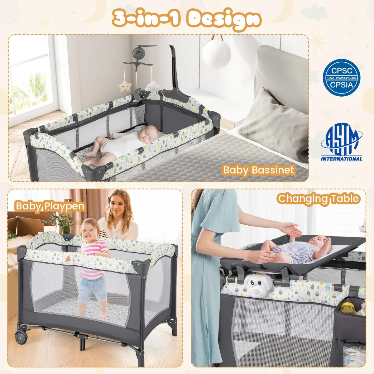 【4-in-1 multifunctioneel】Dit babybedje kan worden gebruikt als wieg, commode, box en reisbedje en voldoet aan verschillende behoeften vanaf maximaal 3 jaar oud.