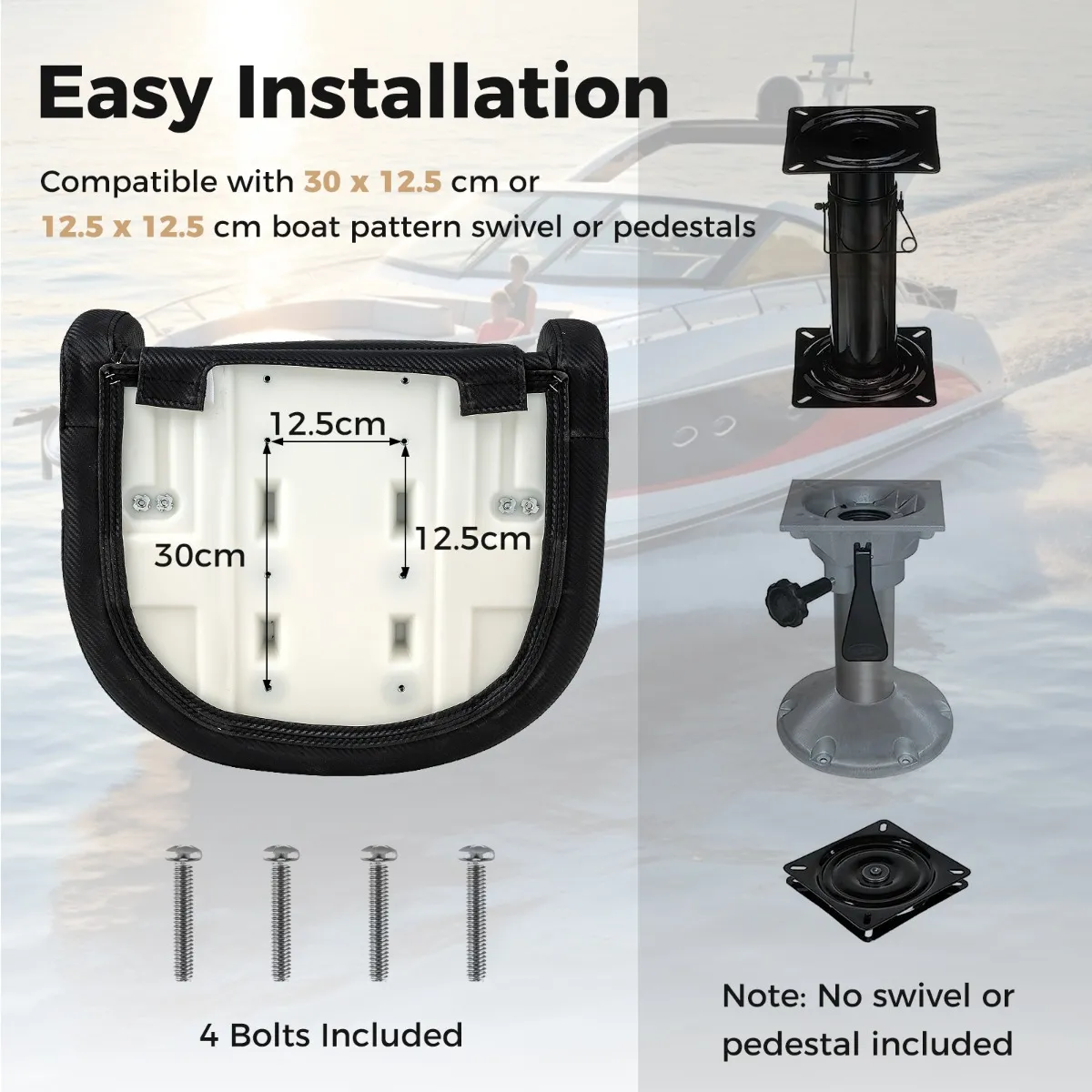 【Eenvoudige installatie】: De bootstoel heeft 6 bevestigingsgaten aan de onderkant en 4 meegeleverde schroeven voor een snelle en eenvoudige installatie op je boot. Hij is compatibel met draaikoppelingen of voetstukken met een montagepatroon van 30 x 12,5 cm of 12,5 x 12,5 cm.